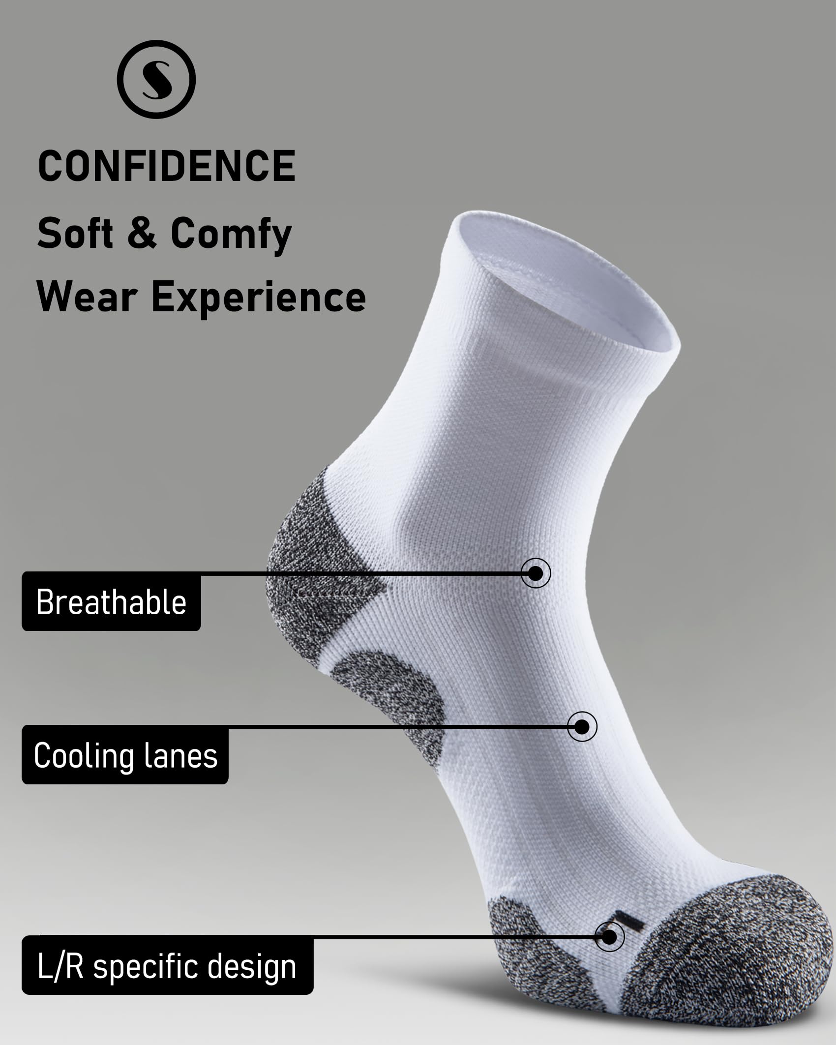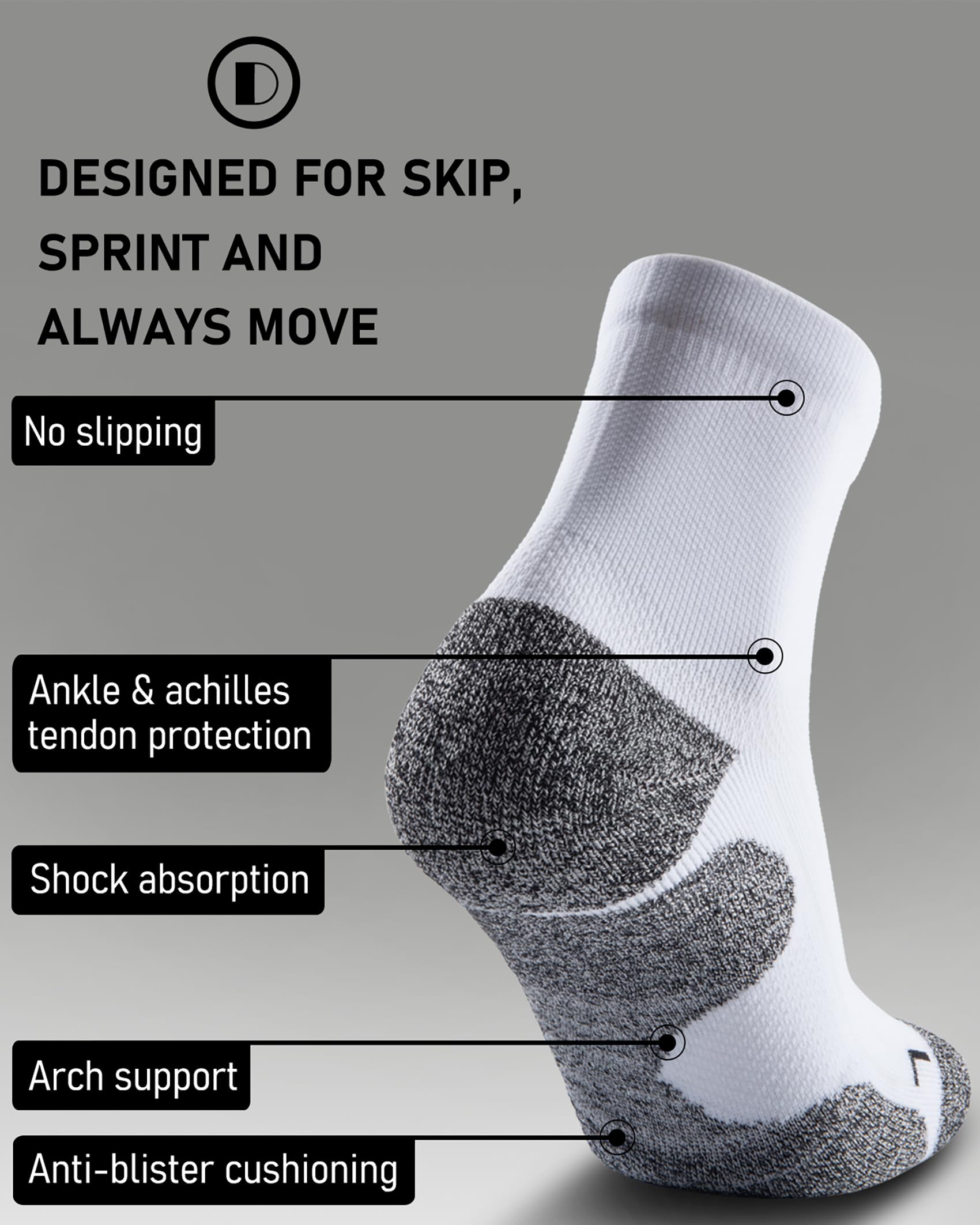 Preferred Skin-friendly Material: Shock-absorbing cushioned soles made of Oeko-Tex Standard 100 combed cotton and tech-dry yarns for moisture wicking, odor-resistant and durable