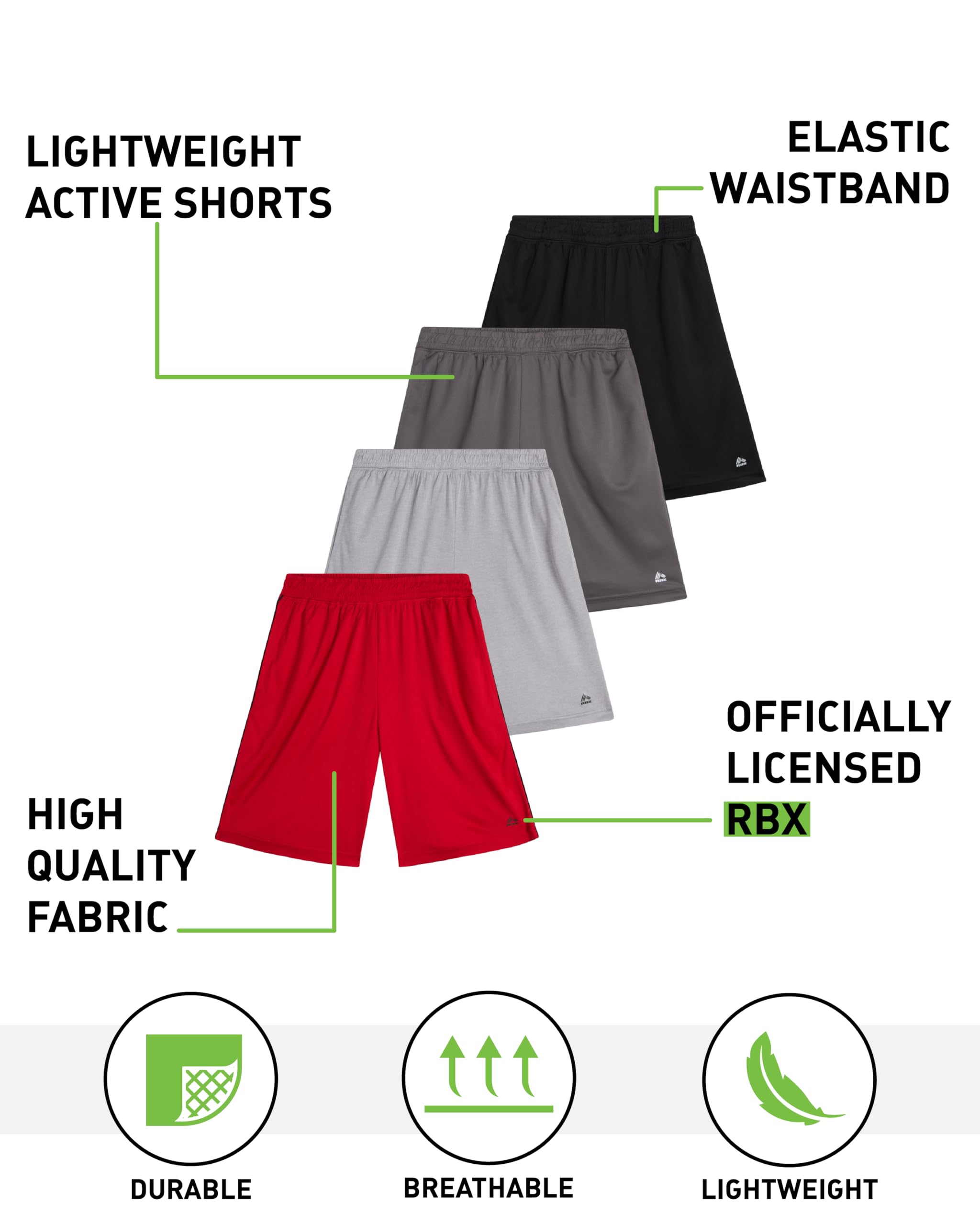 Description Double the performance, quadruple the value, RBX Boys’ Mesh Athletic Shorts now come in a convenient 4 Pack to keep up with every activity on your young athlete’s schedule. These boys mesh shorts are designed with breathable fabric and moisture-wicking technology to ensure all-day comfort, whether he’s hitting the court, field, or playground. Made for movement and built to last, these athletic shorts for boys deliver four versatile options for nonstop action. Each pair of these boys basketball shorts is crafted from lightweight mesh that promotes airflow and dries quickly, making them ideal for gym class, practice, or weekend fun. Whether you're shopping boys gym shorts, basketball shorts youth, or baseball shorts boys, this pack has him covered. Perfect for kids athletic shorts or shorts for teen boys, these are a great addition to every young athlete’s wardrobe. With a flexible elastic waistband, these boys' athletic shorts provide a secure, adjustable fit for all-day wear. Easy to pull on and off, they’re great shorts for kids who live life on the move. Ideal for boys clothes size 10-12 youth, boys size 8 shorts, or boys basketball shorts size 14-16, this 4 Pack gives you four pairs of youth boys shorts that are ready for any sport or season. Whether you're after shorts for boys 10-12, big boys shorts, or just dependable boy athletic shorts for growing kids, these are the answer. The sleek black design and sporty colors pair easily with any outfit, making them the perfect black shorts boys can wear anywhere. From kids shorts boys to boys sports shorts, these versatile styles work great for school, team sports, or laid-back weekends. Stock up on shorts kids love with this value-packed 4 Pack of RBX youth basketball shorts, perfect for boys baseball shorts, teen boy shorts, and everything in between.