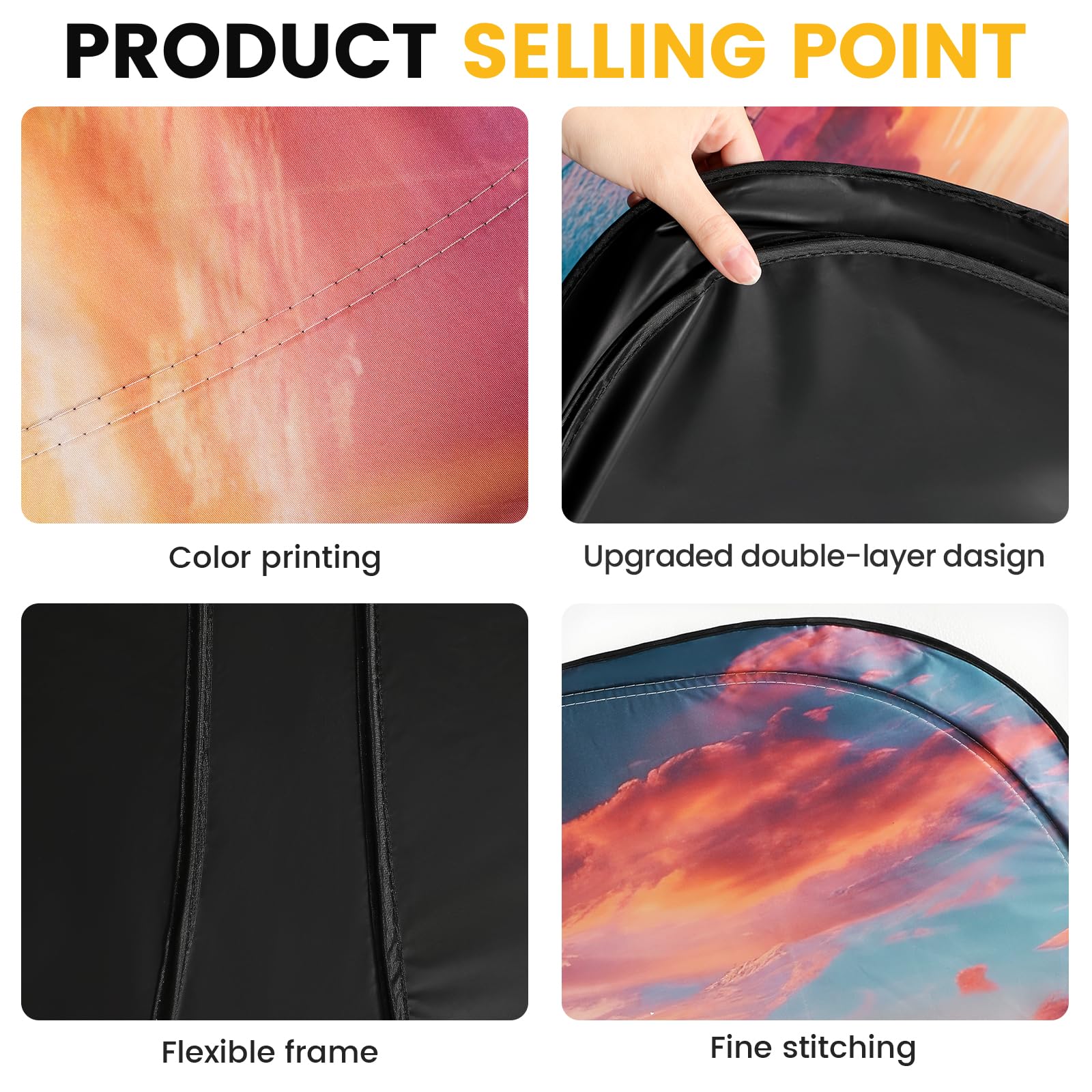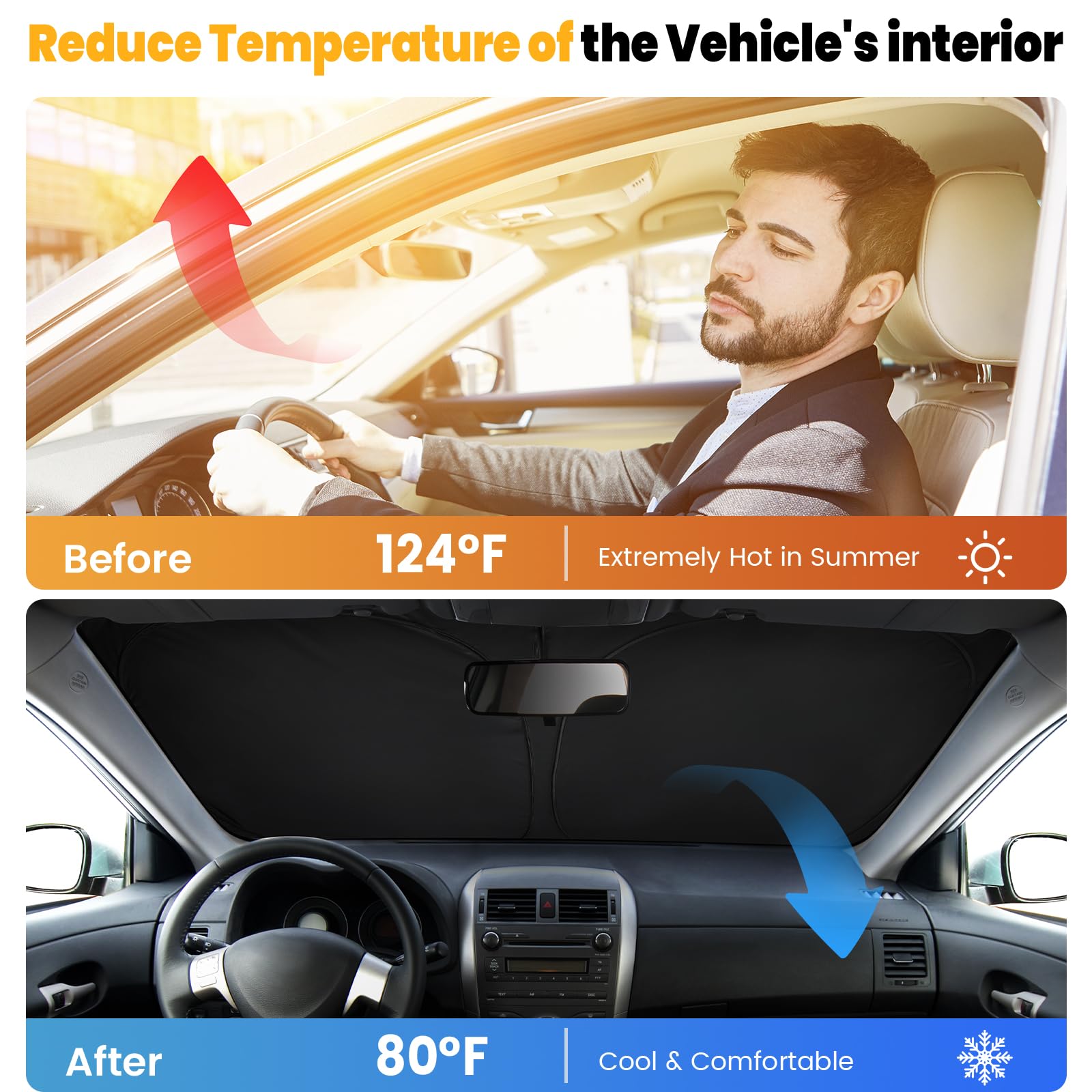Easy to Install - Installing the sunshade is very simple. Unfold the sunshade and place it at the bottom of the front window, with the pattern side facing outward and the black side facing inward. Use the sunshade to press it down and then fix it above the rearview mirror with magic tape