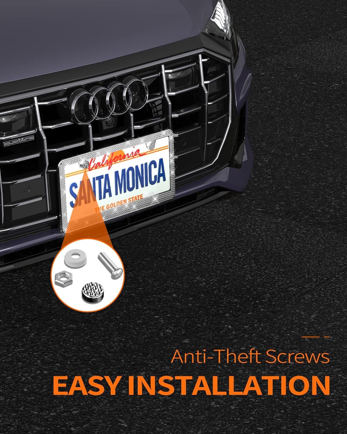 PREMIUM QUALITY: HOTOR glittering car plate frame features over 1,000 shiny rhinestones securely sticking on the stainless steel frame with waterproof glue by hand, making it not easy to fall off even in the long-term use. Moreover, the carefully-polished license plate frame will not scratch your car or your hands.
