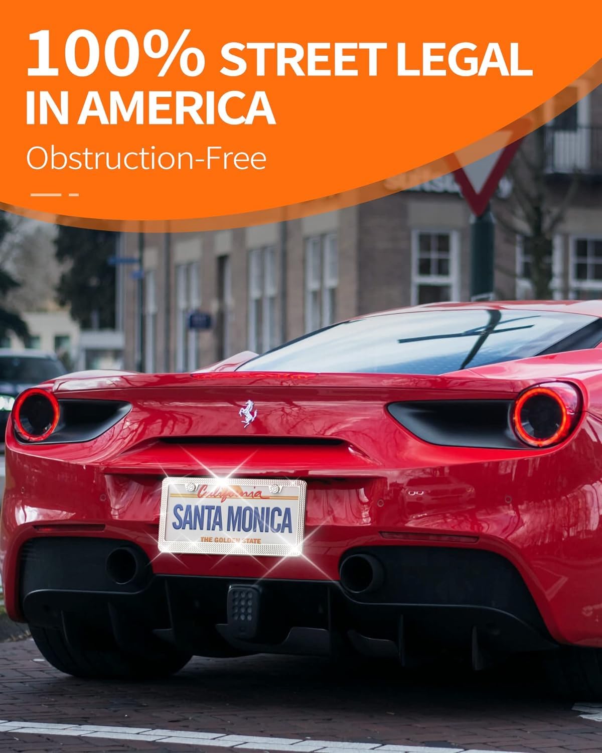 100% STREET LEGAL: HOTOR brilliant license plate frame for women perfectly fits any standard-sized license plate in any state in the United States. It will not block the registration tag or state name. Just rest assured that this universal license plate holder won't bring any troubles throughout your drive.