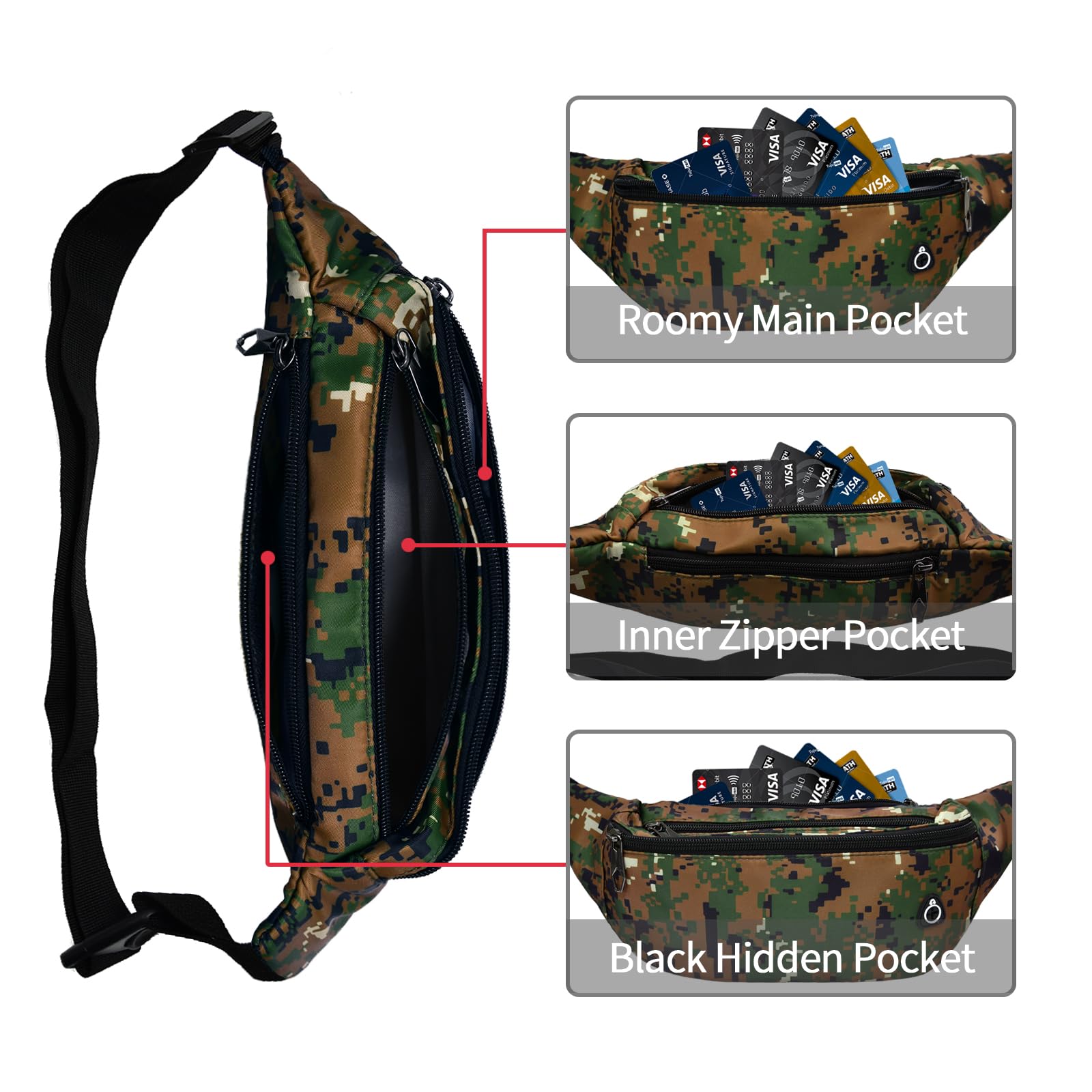 【Fanny Pack with 3 Zippered Compartments】Include main pocket,front pocket and back pocket. (1)Main pocket can easily hold your most needed items such as purse, keys and other items. (2) Front pocket can easily carry your phone, because it is large and seperate. (7)On the back side is great for you to keep your valuables away from the thieves.
