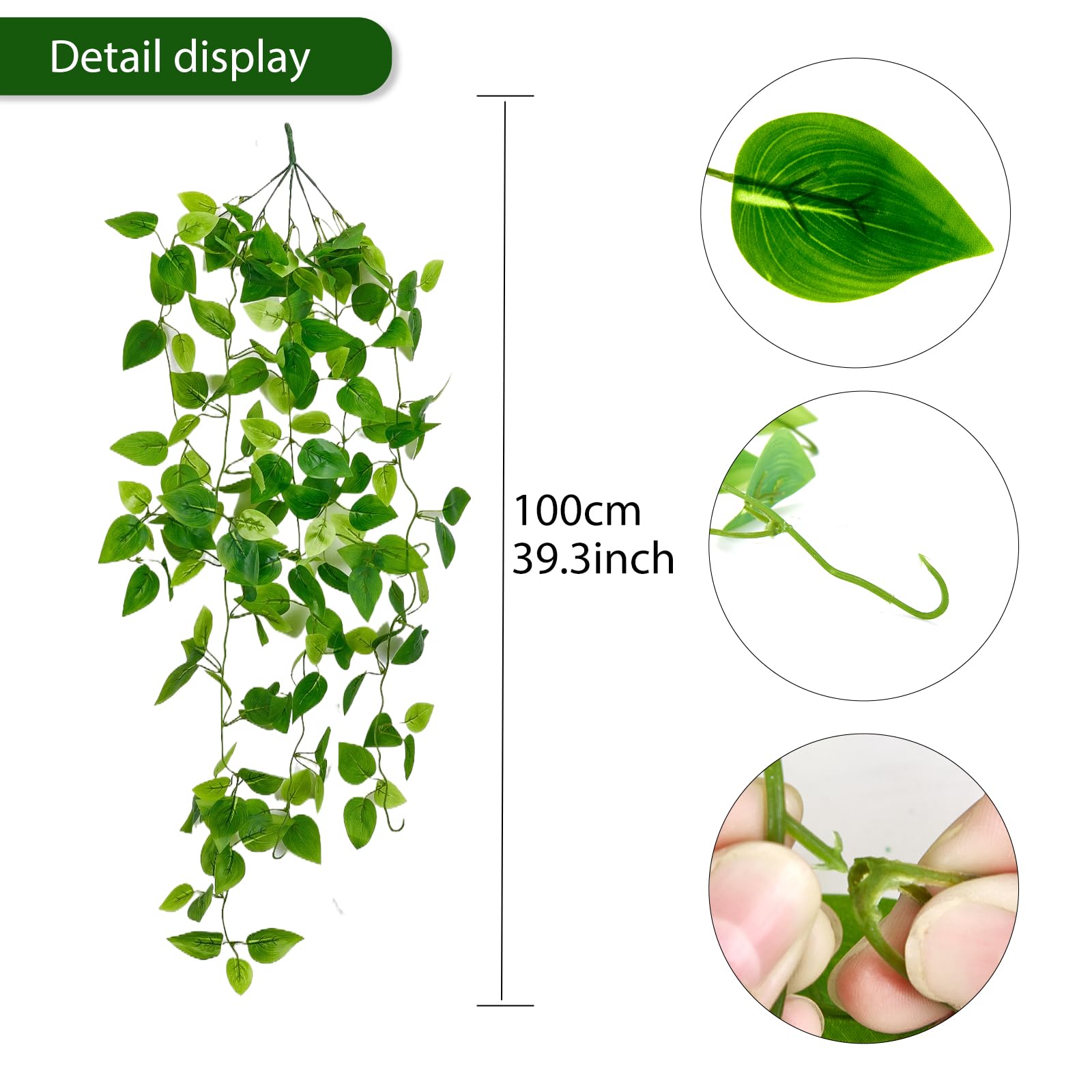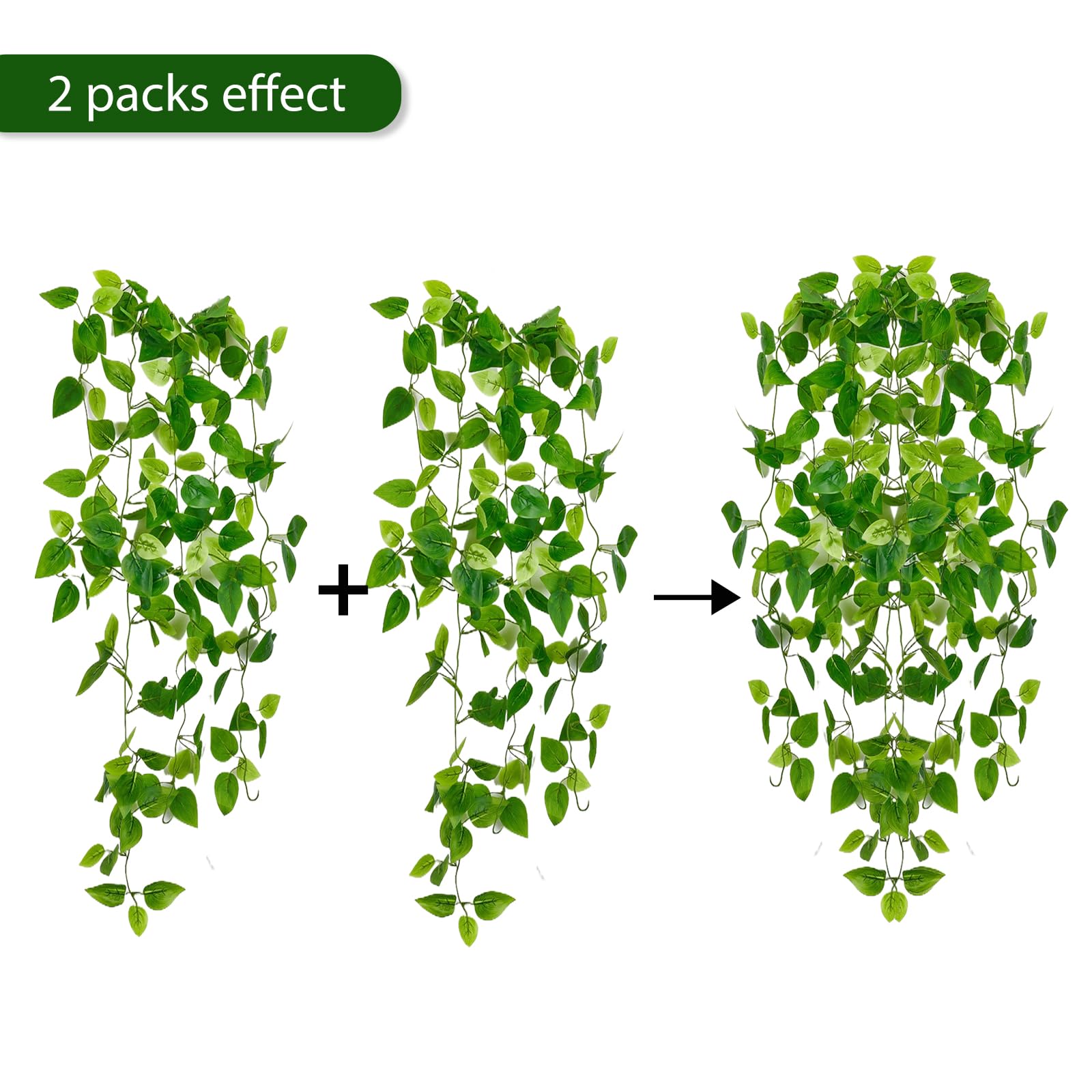 【Package Content】:2pack of artificial hanging plants, fake ivy total length is about 3.6 feet. The artificial hanging plant has 5 forks and about 160 fake green leaves.
