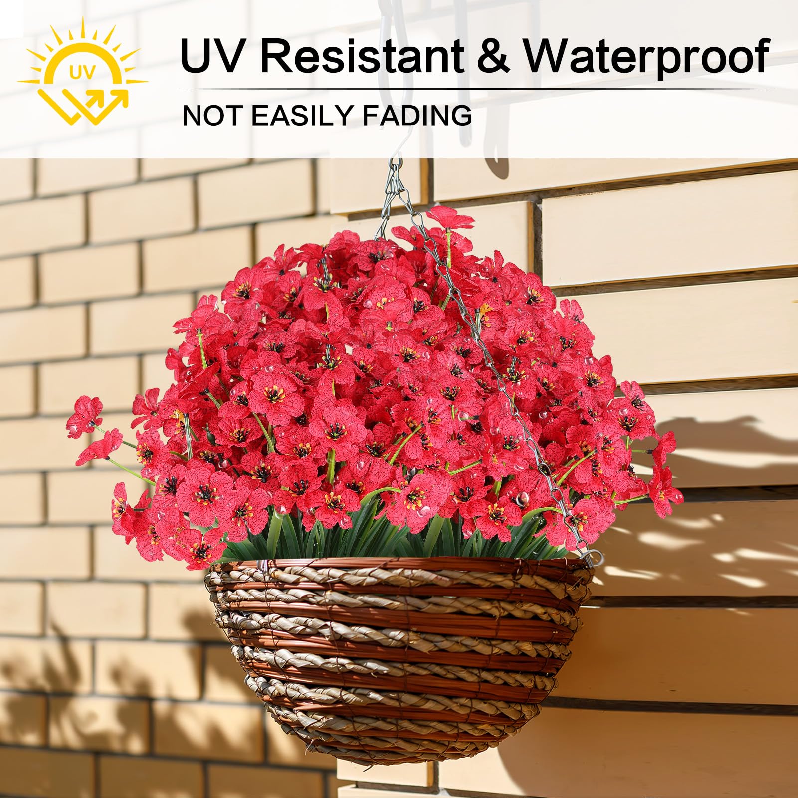 No Fade - The Fake flowers are waterproof and sunscreen, and are not easy to fade.they are holding their own in full sun and no watering needed and very flexible and realistic to the point they have a soft gentle sway on a windy day