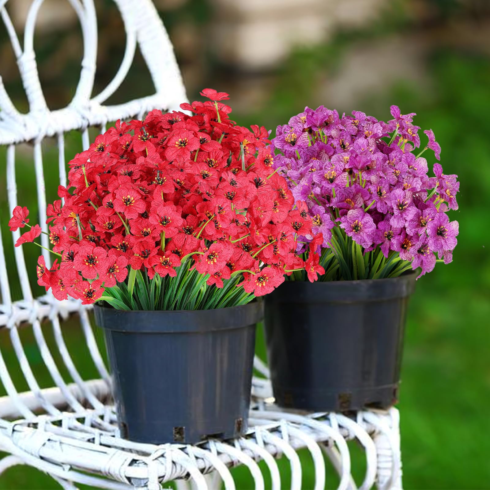 Perfect for Outdoor/Indoor - Plastic flowers are ideal for outdoor porches,walkway,terraces windox box,front yard,pots,hanging planters,gardens,landscape,windowsills,allow you have beautiful color all year around.Also suit for birthdays,weddings,memorial place or grave,they can live anywhere and have withstood heavy rain storms and winds