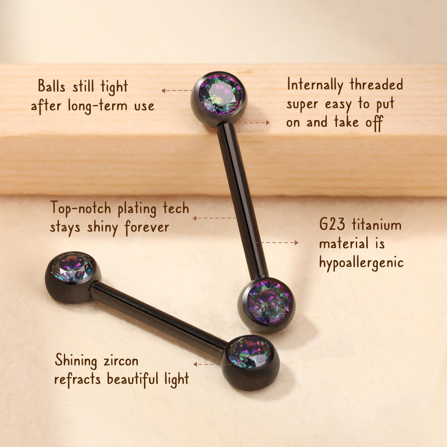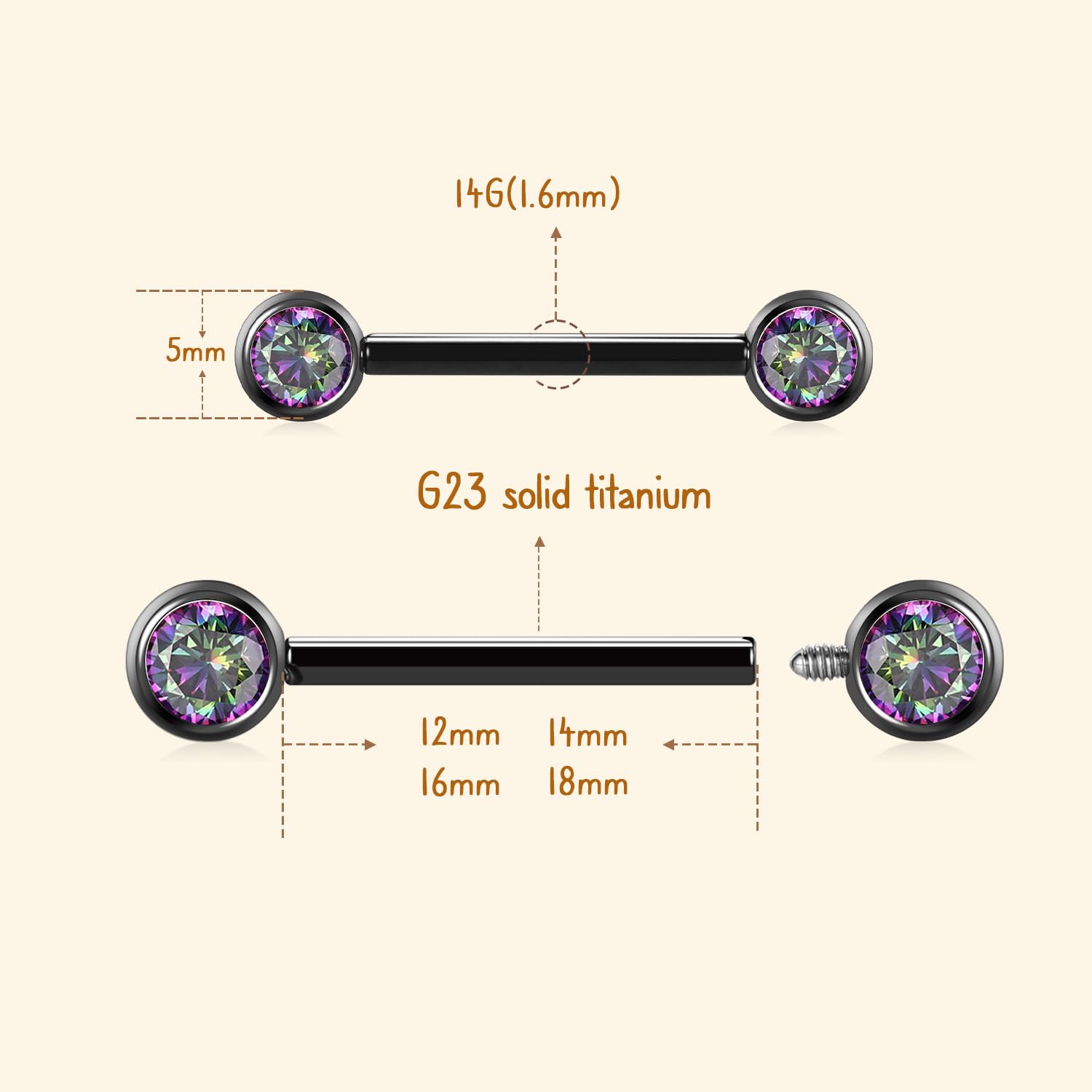 Size and Color:Gauge:14g nipple rings,Nipple Barbell Length:9/16"(14mm) CZ Size:5mm.Color: Black+Vitrail Medium CZ