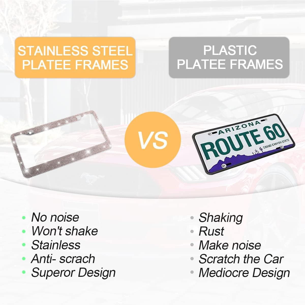 Premium Quality: Our license plate frame is made of stainless steel and fully covered with gorgeous handcrafted crystal, sturdy and lightweight. The edge of license plate frame has been covered to prevent scratching paint.