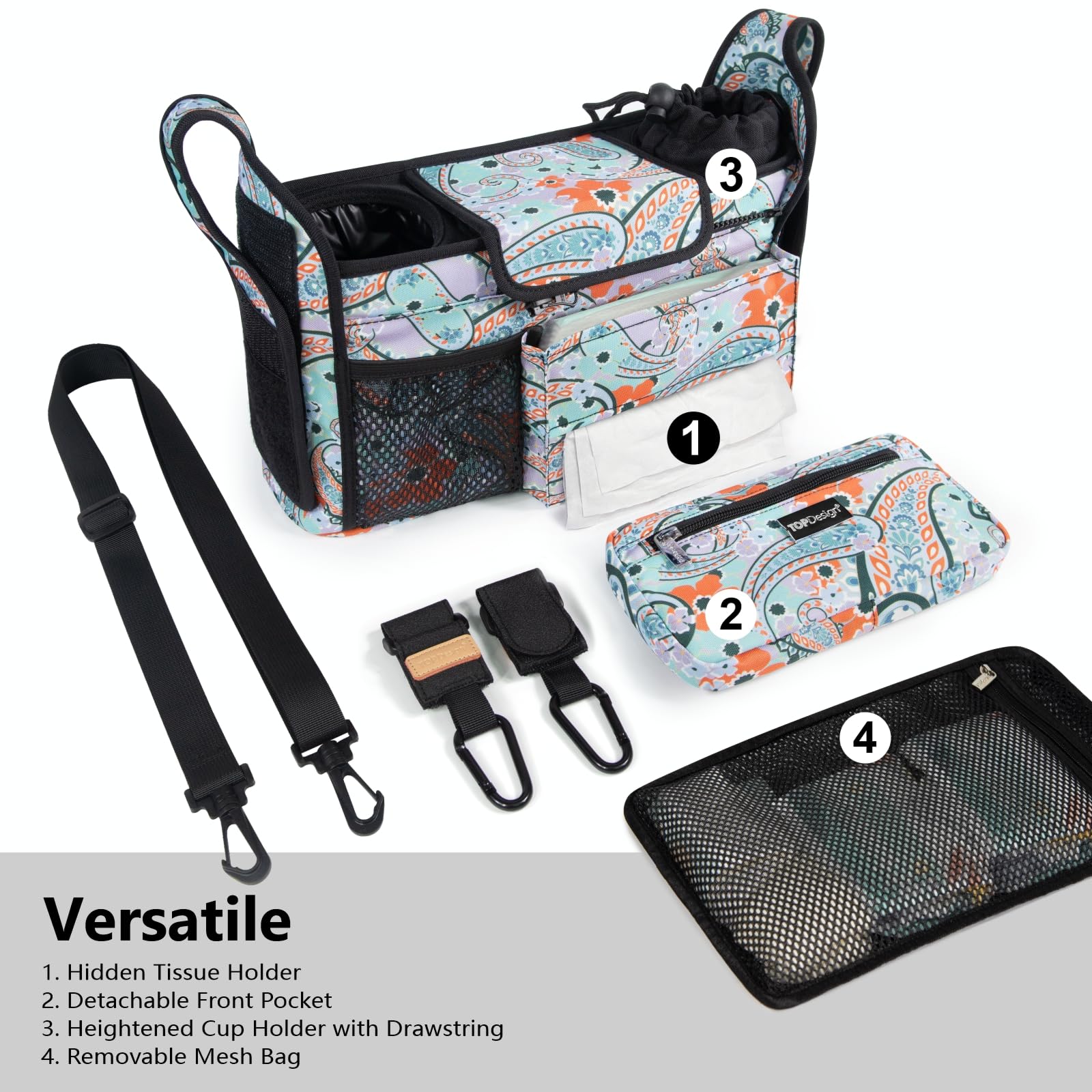 UPGRADED VERSION WITH DETACHABLE MESH BAG: A mesh laundry bag is added for extra storage to stash baby's change clothes or diapers. It's detachable and can be put directly into the washing machine. Multi-functional partition design of our stroller organizer helps you keep all baby essentials organized and within reach. 2 insulated cup holders for your baby bottle, water bottles or coffee cup. The hidden wipe dispenser allows you to quickly grab wipes.