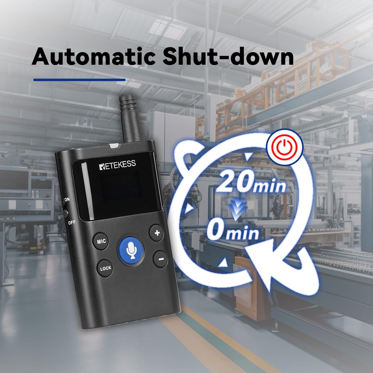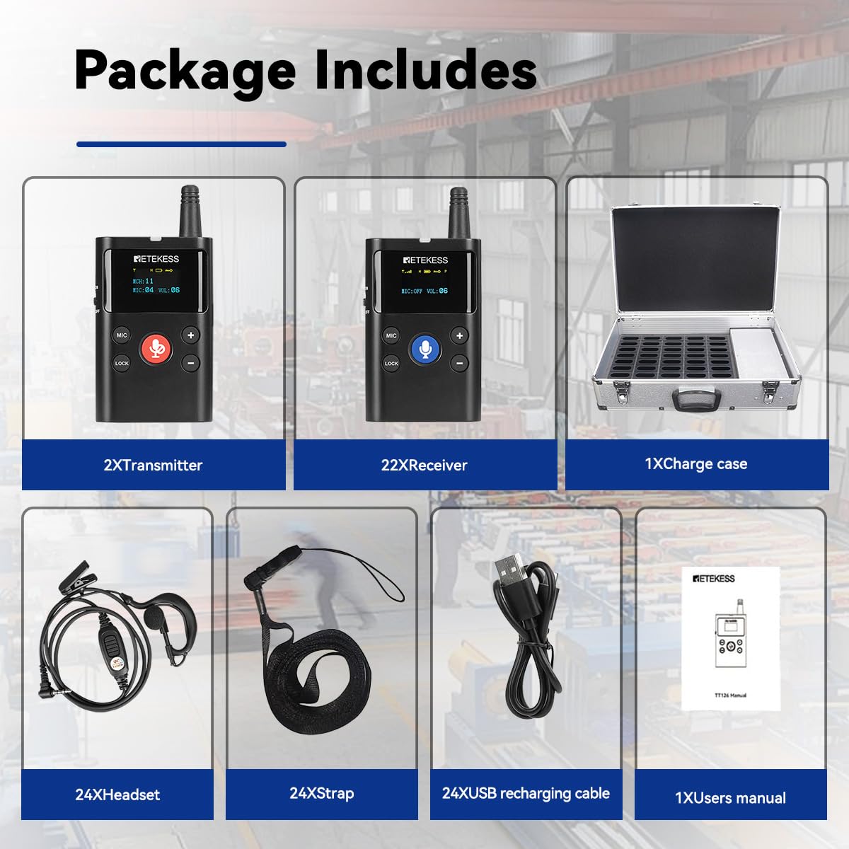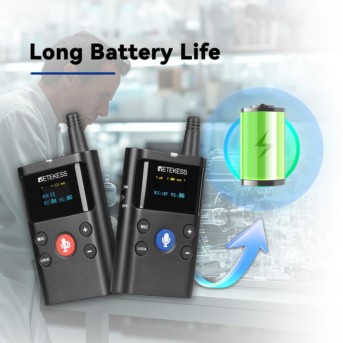 Long Battery Life;Retekess TT126 wireless two-way tour guide system has a battery life of up to 10 hours for the main transmitter and 10 to 70 hours for the receiver when fully charged; this ensures the system can be used all day without frequent charging