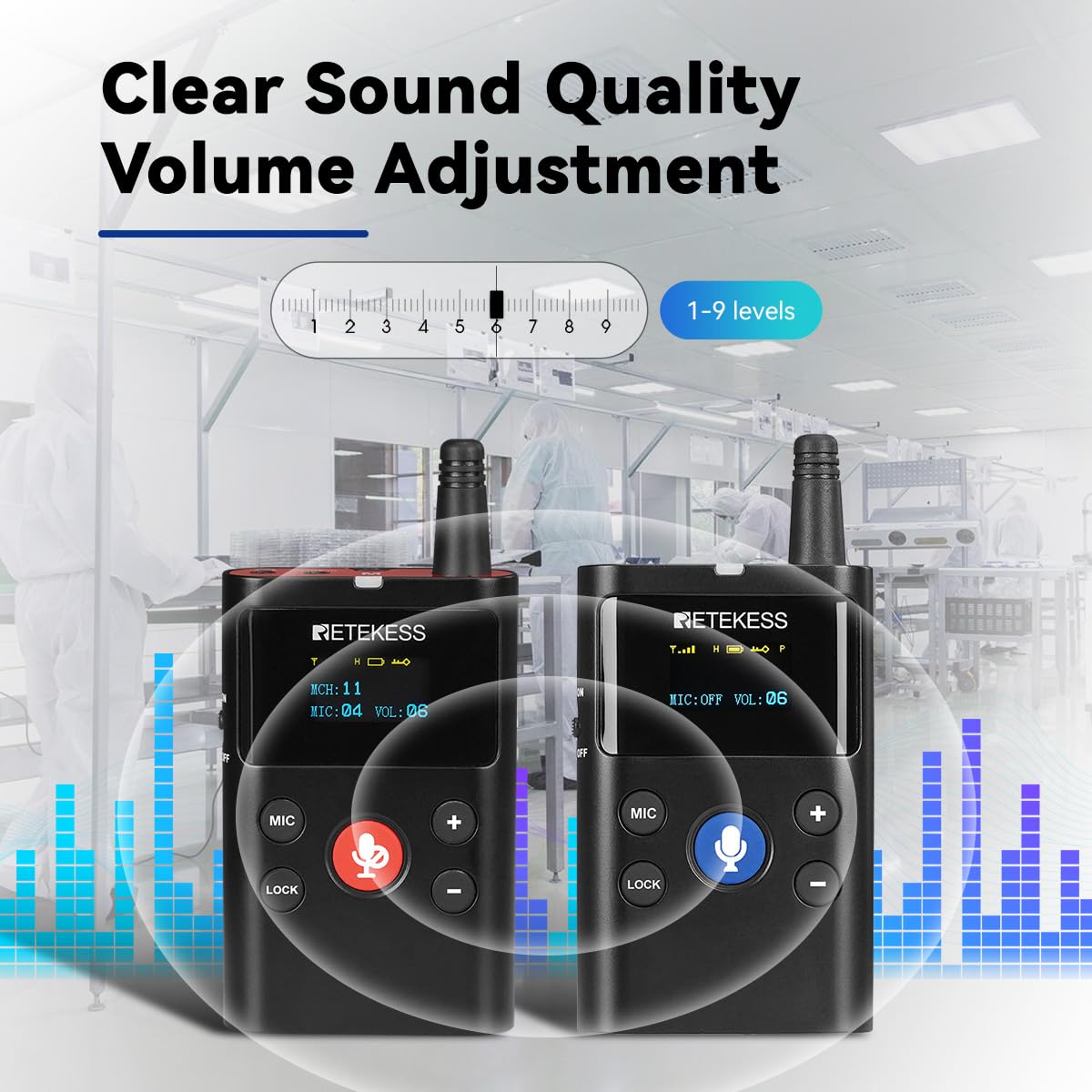 Volume Adjustment;two-way wireless tour guide system features adjustable microphone gain from 1 to 7 levels; during factory inspections, the adjustable volume ensures everyone on your team can be heard clearly, regardless of ambient noise