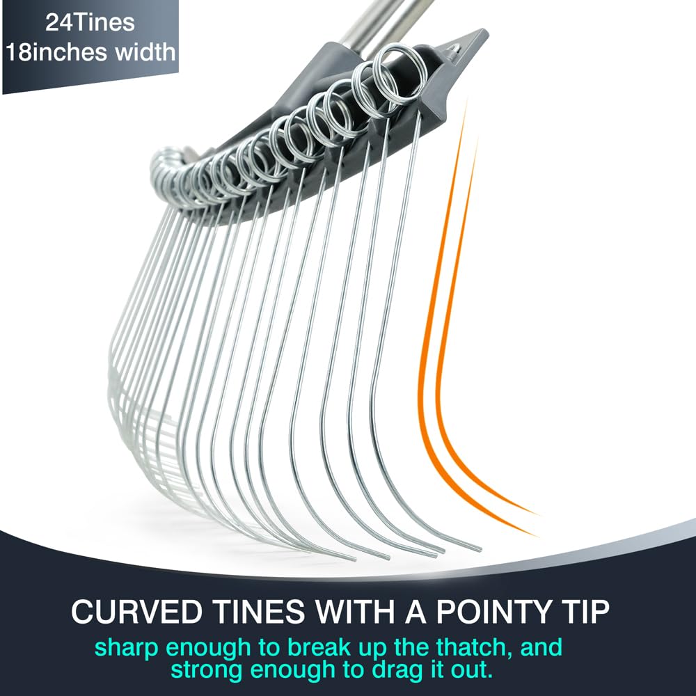 EASY TO USE & CLEAN IT OFF -- the angled, spring-loaded tines are sharp enough to break up the thatch, and strong enough to drag it out, requiring no down pressure and allow you to rake standing up. When debris collect on the tines, all you need to do is to flip it over and rub it on the lawn, the dead grass come out easily.