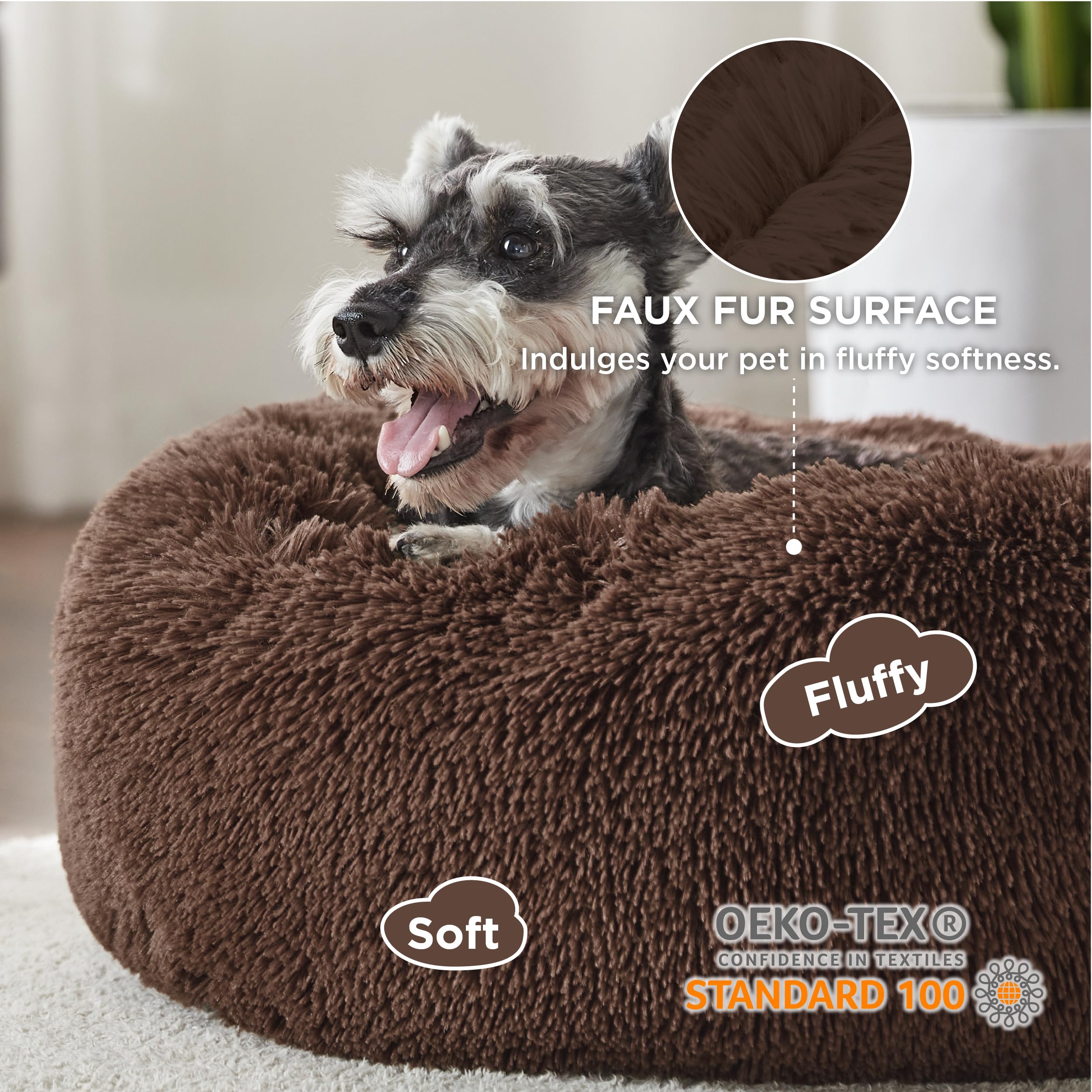 Pet-Safe & Thoughtful Details:Crafted with Standard 100 by OEKO-TEX(24.HCN.46956) certified materials, this calming dog bed is made from tested-safe fabrics gentle on pets. The sturdy, non-slip base keeps the round pet bed in place, so your furry friend can hop in and out with comfort.