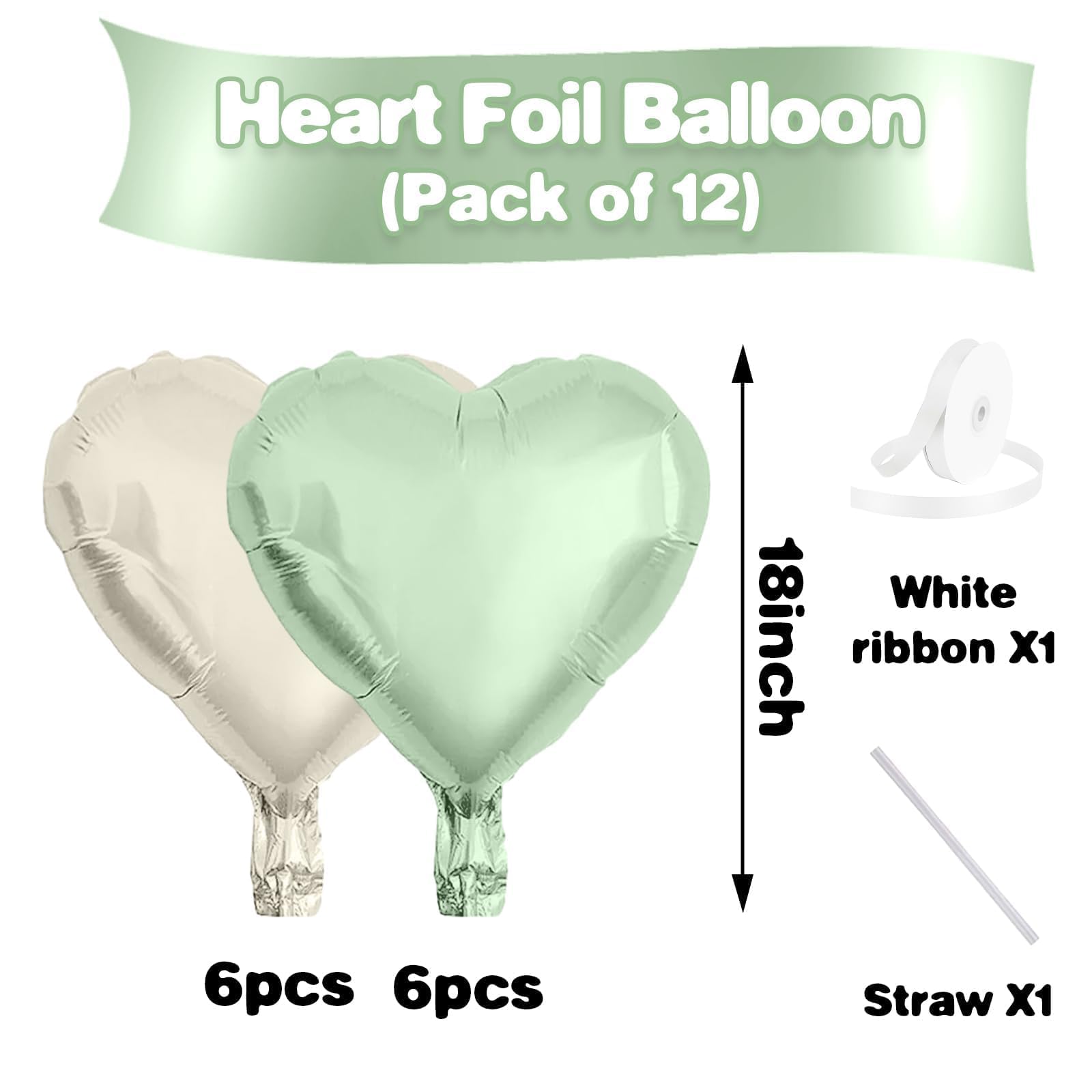 Sage Green White Heart Balloons: The package includes 12pcs 18-inch heart balloons(sage green*6,cream*6),1 roll white ribbon and 1 straw.Great for creating a romantic and cheerful atmosphere. Whether you're celebrating a wedding, baby shower, or Valentine's Day, these sage green white heart balloons add a beautiful touch to your special event.