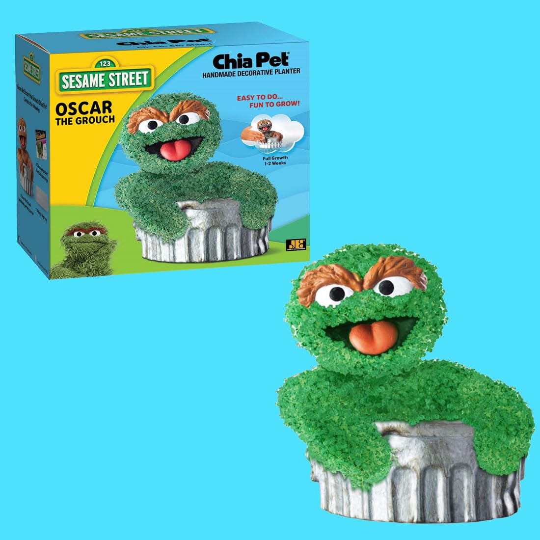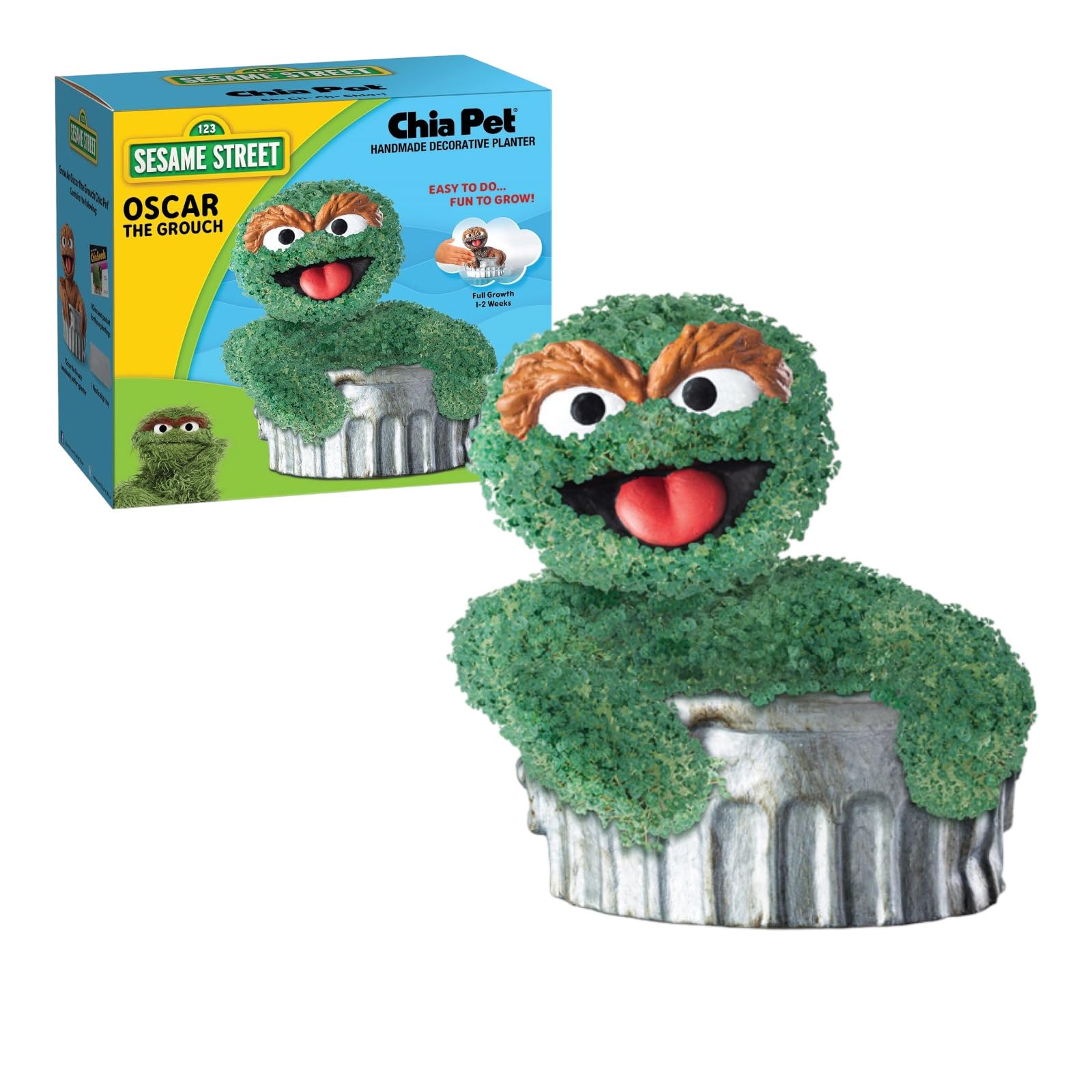Straight from Sesame Street it’s Oscar the Grouch Chia Pet! Help Oscar grow his signature green coat, just spread the Chia seeds, water, and watch him grow. An interactive way to learn about planting, Oscar the Grouch Chia Pet makes a great gift for kids and adults. Handmade terracotta pottery planter comes with 1 packet of Chia® seeds good for 3 plantings, convenient plastic drip tray and planting & care instructions. In just 1-2 weeks your Oscar th Grouch Chia Pet will achieve maximum growth. Chia Planters can be washed and replanted indefinitely.