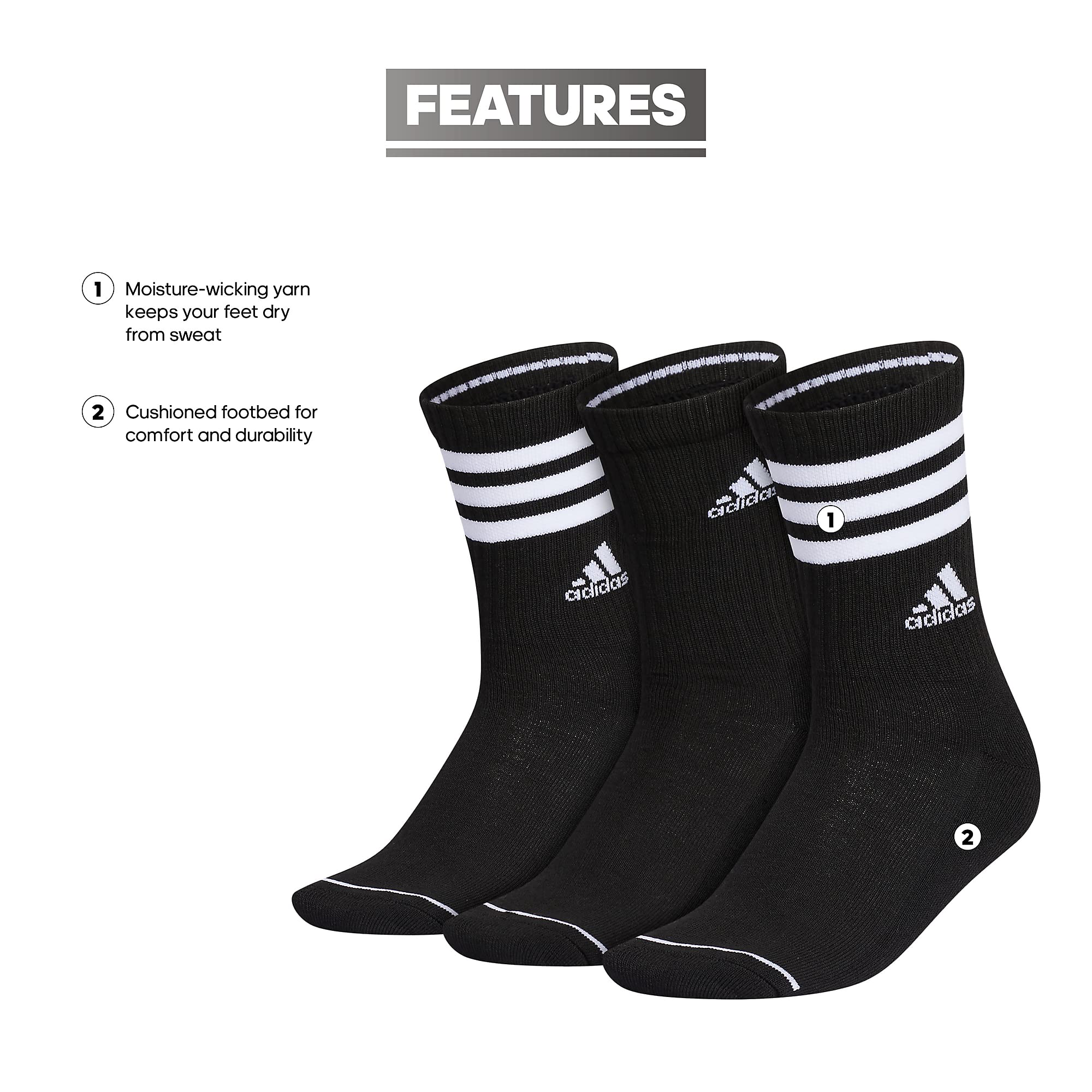 Description From fitness class to coffee run, these crew-length adidas socks keep you in action. Stylish yet sweat-wicking, they help feet stay dry, reducing the chance of chafing. The cushioned footbed adds an extra layer of comfort when you up the pace. Suitable as gym socks women, these athletic socks provide great support. Available in various styles, these women's socks cater to different preferences.