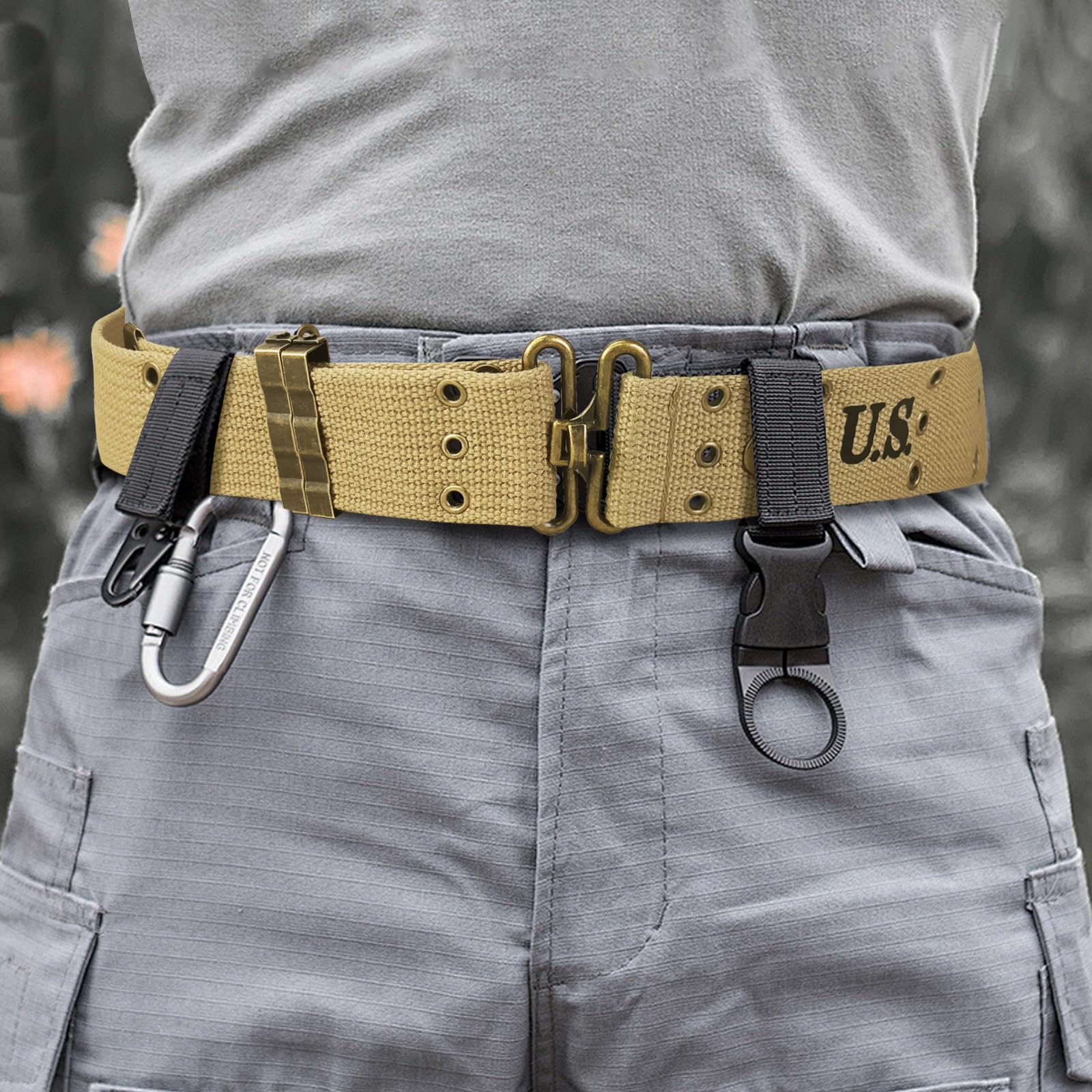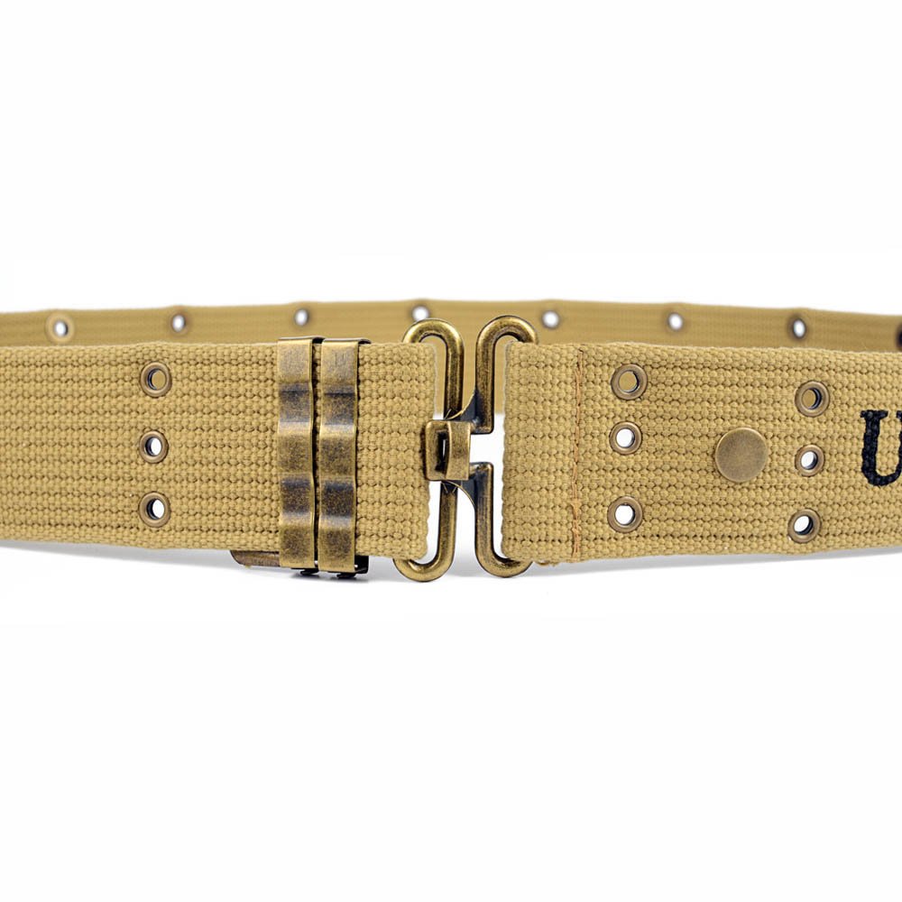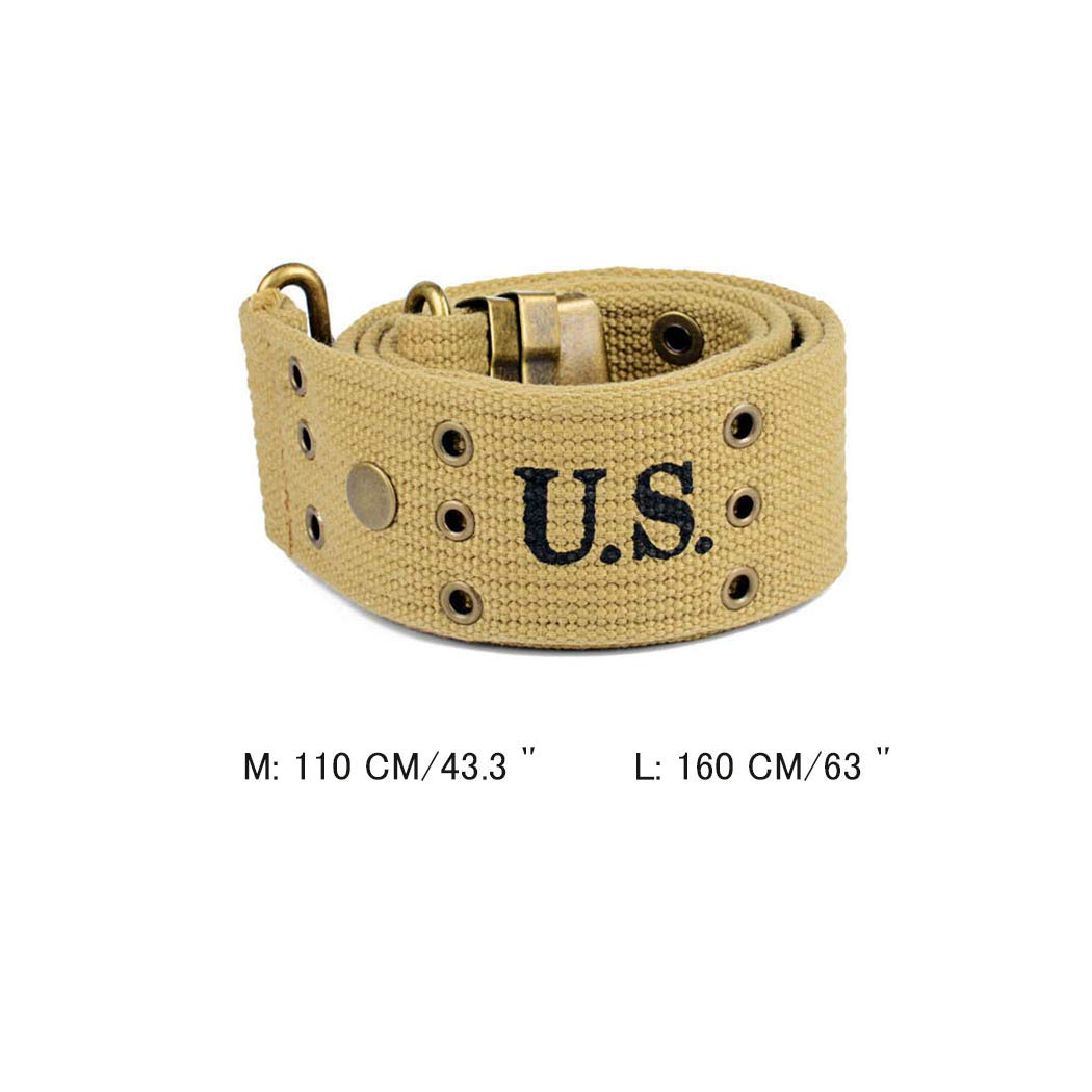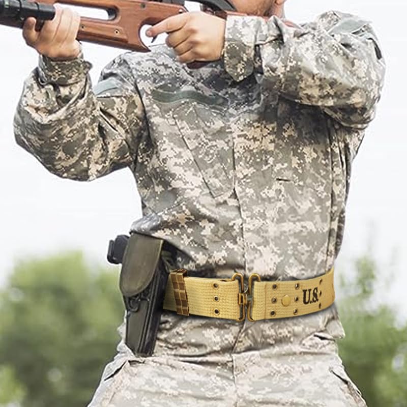 Heavy-Duty Construction: Rugged canvas material and sturdy buckle ensure long-lasting durability.Adjustable belt with multiple holes for a secure, comfortable fit.Three rows of metal eyelet's, the top row is to attach to the M36 suspenders, the middle row allows the belt to be adjusted in size, and the bottom row allows pistol holsters and first aid pouches etc