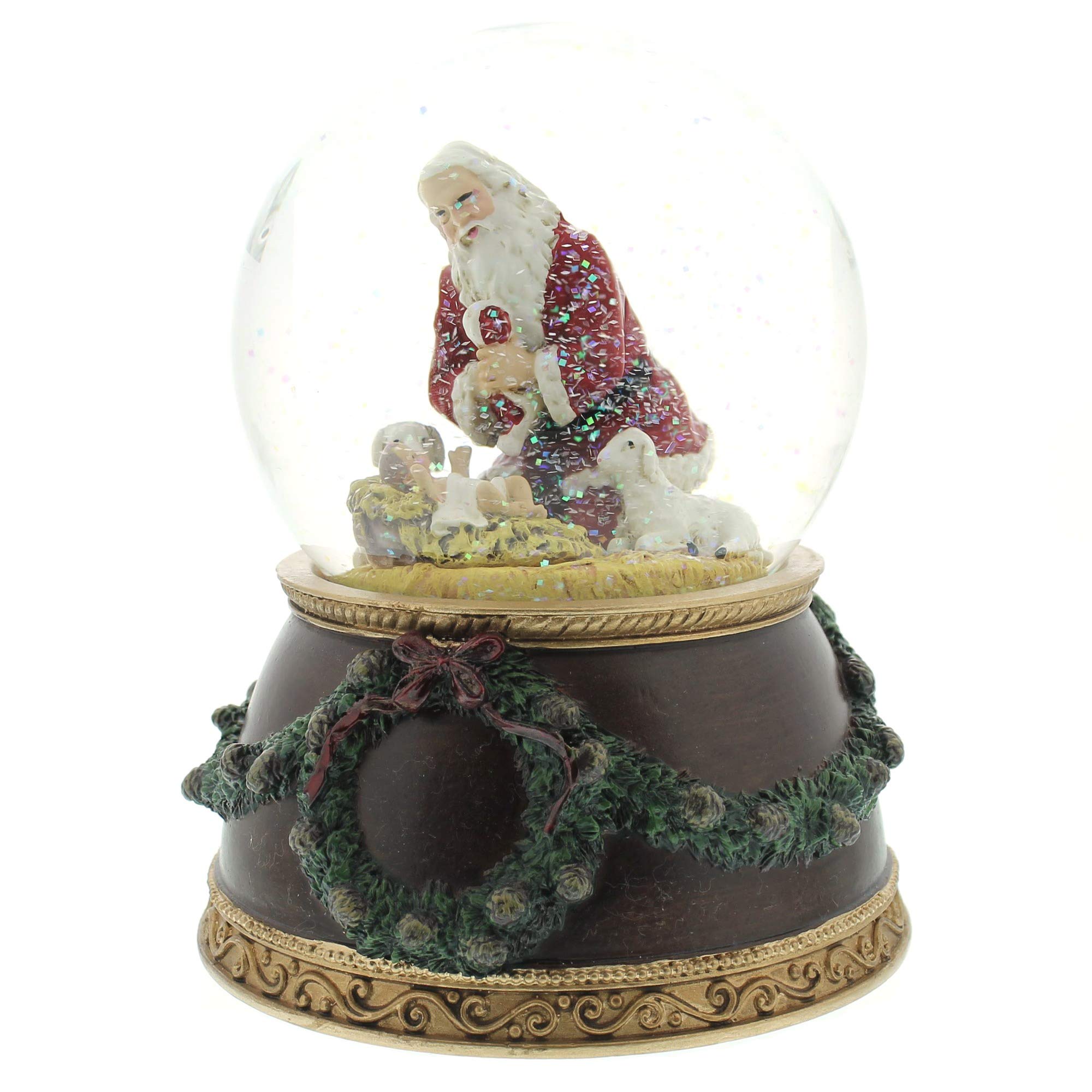 . Kneeling Santa Glitterdome. Plays to the tune of O' Come All Ye Faithful. Made from resin, glass, and water. Approximately 4.5 inches tall (11 cm). Dome is approximately 80 millimeters in diameter (8 cm). Includes original manufacturers box and packaging. Made by Roman