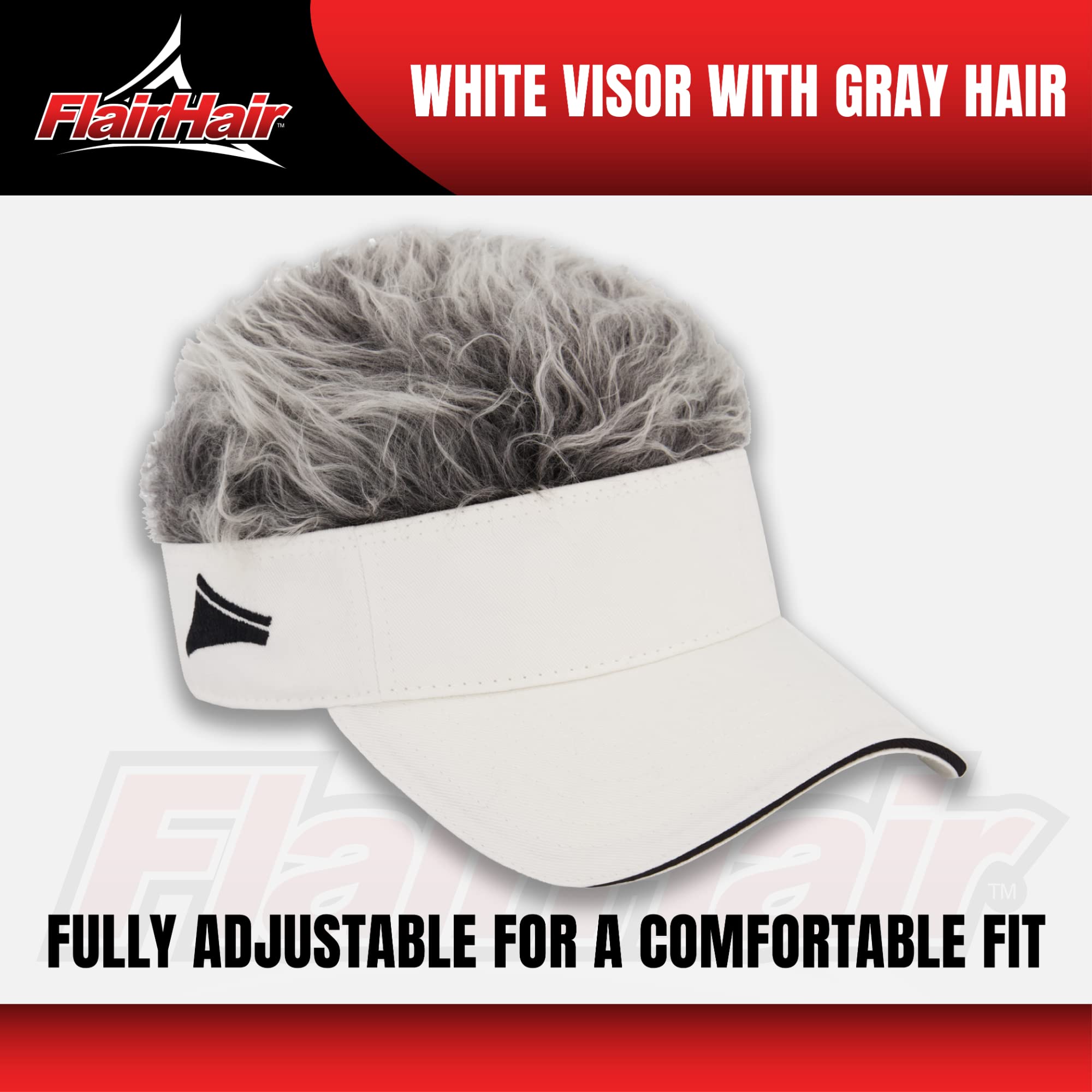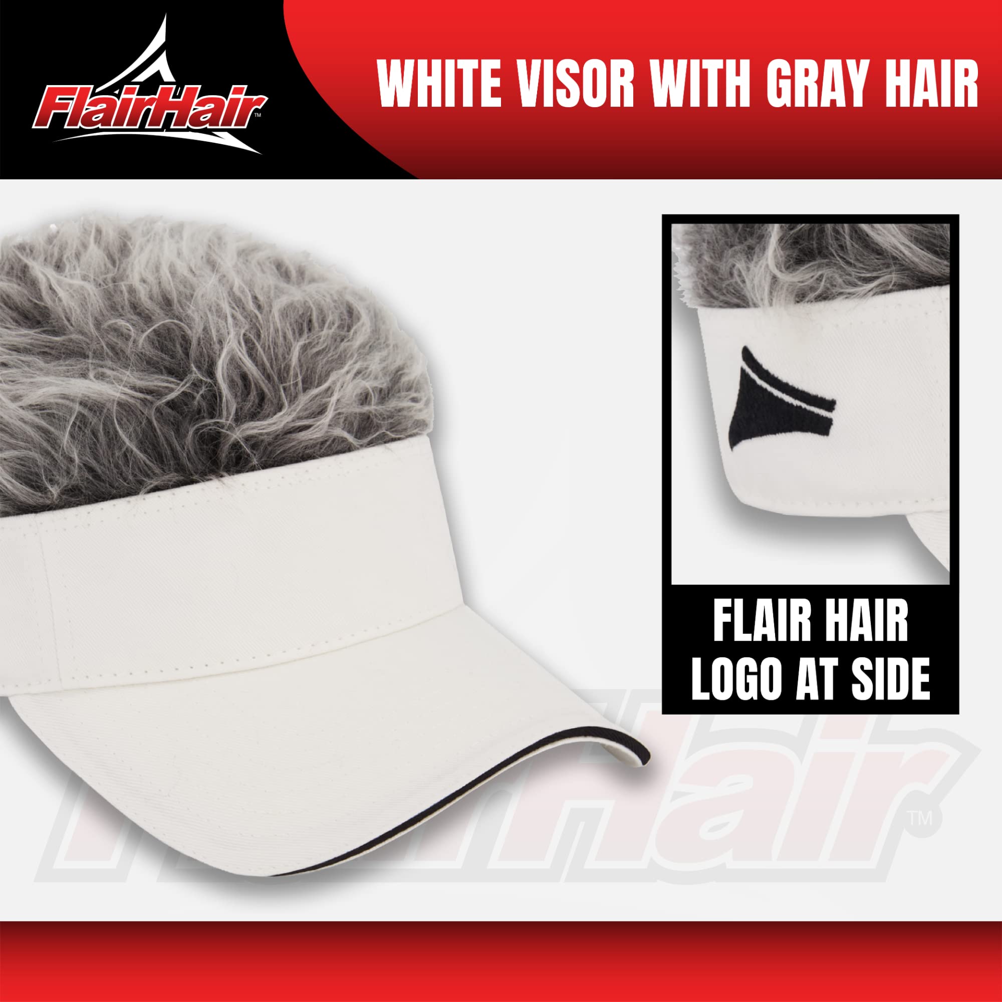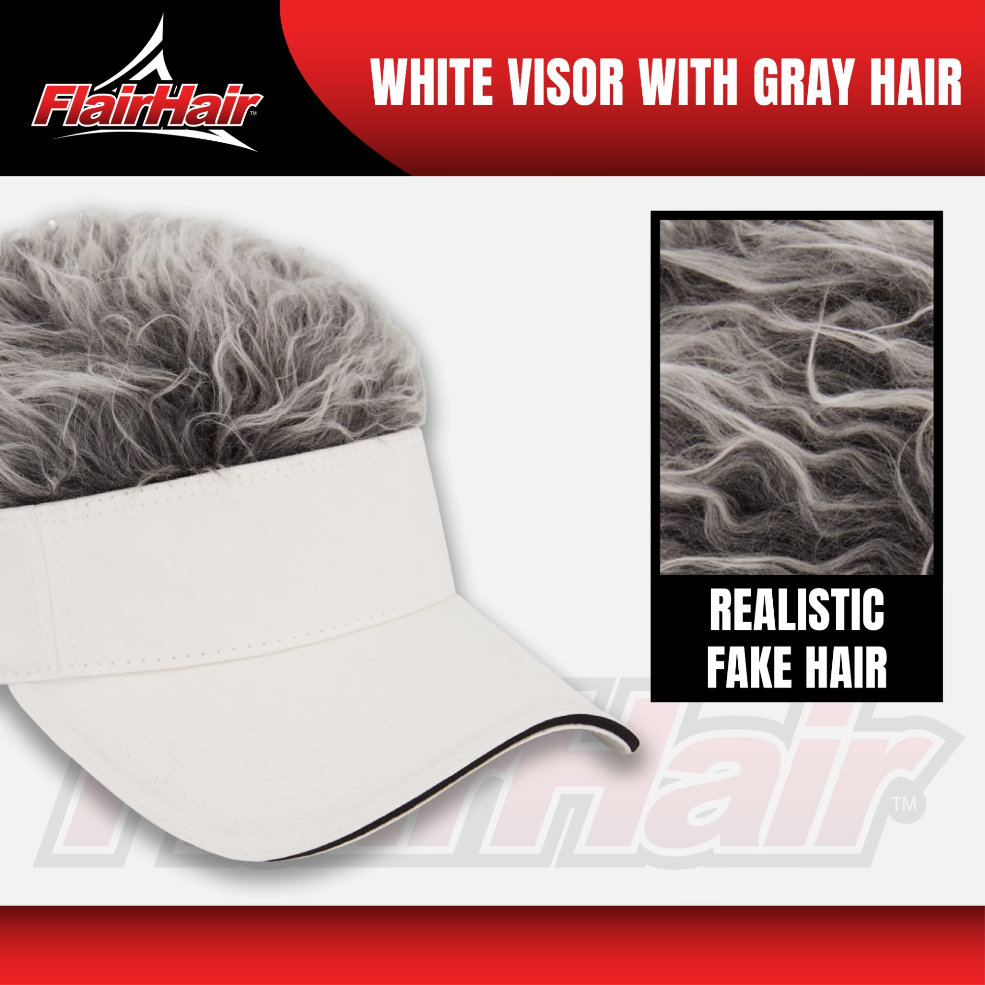 Flair Hair Sun Visor Cap with Fake Hair, Grey Hair with White Adjustable Baseball Hat, White