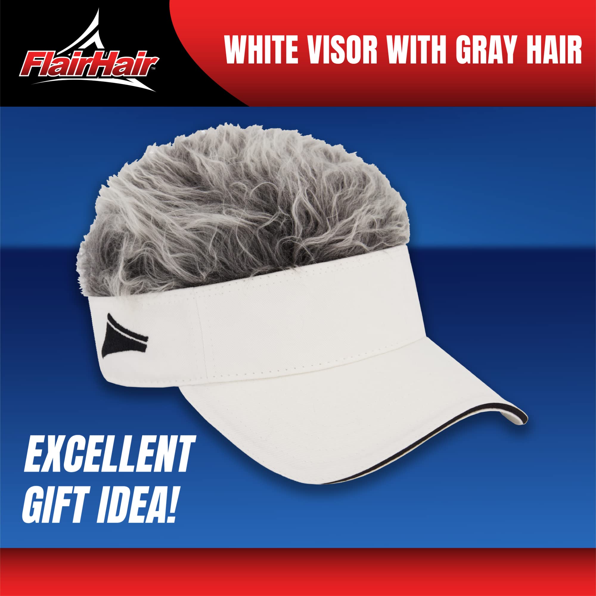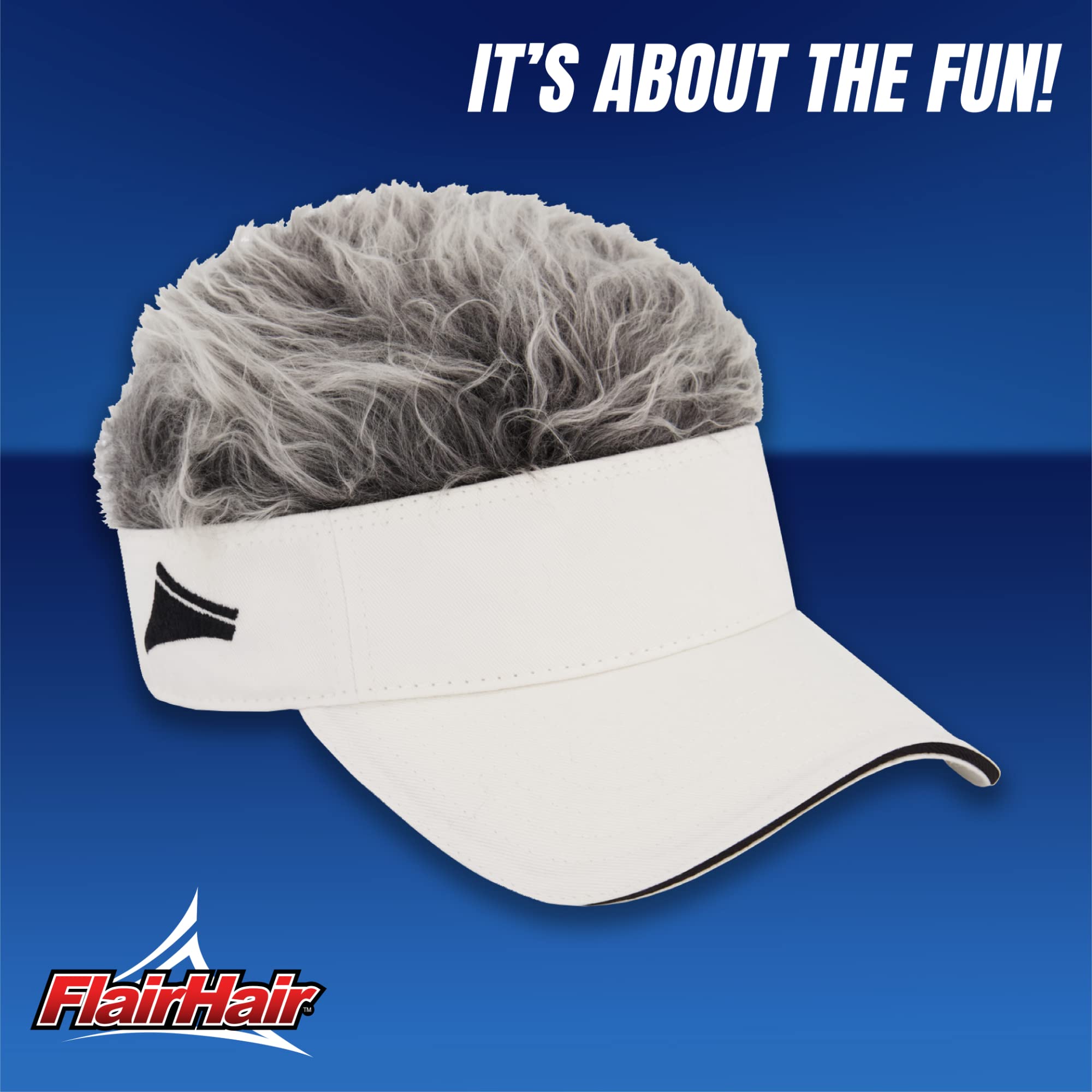 Description Give a hilarious gift that adults of all ages can enjoy with these funny flair hair frosted tips caps. The fake hair headband features an adjustable hook and loop closure on the back to allow for a comfortable fit on heads of all shapes and sizes, and its curved brim provides protection from bothersome sunlight while golfing, hiking, or simply out and about while outdoors. This funny golf visor makes for a humorous addition of any white elephant gift exchange or birthday, and is sure to be the talk of the party!