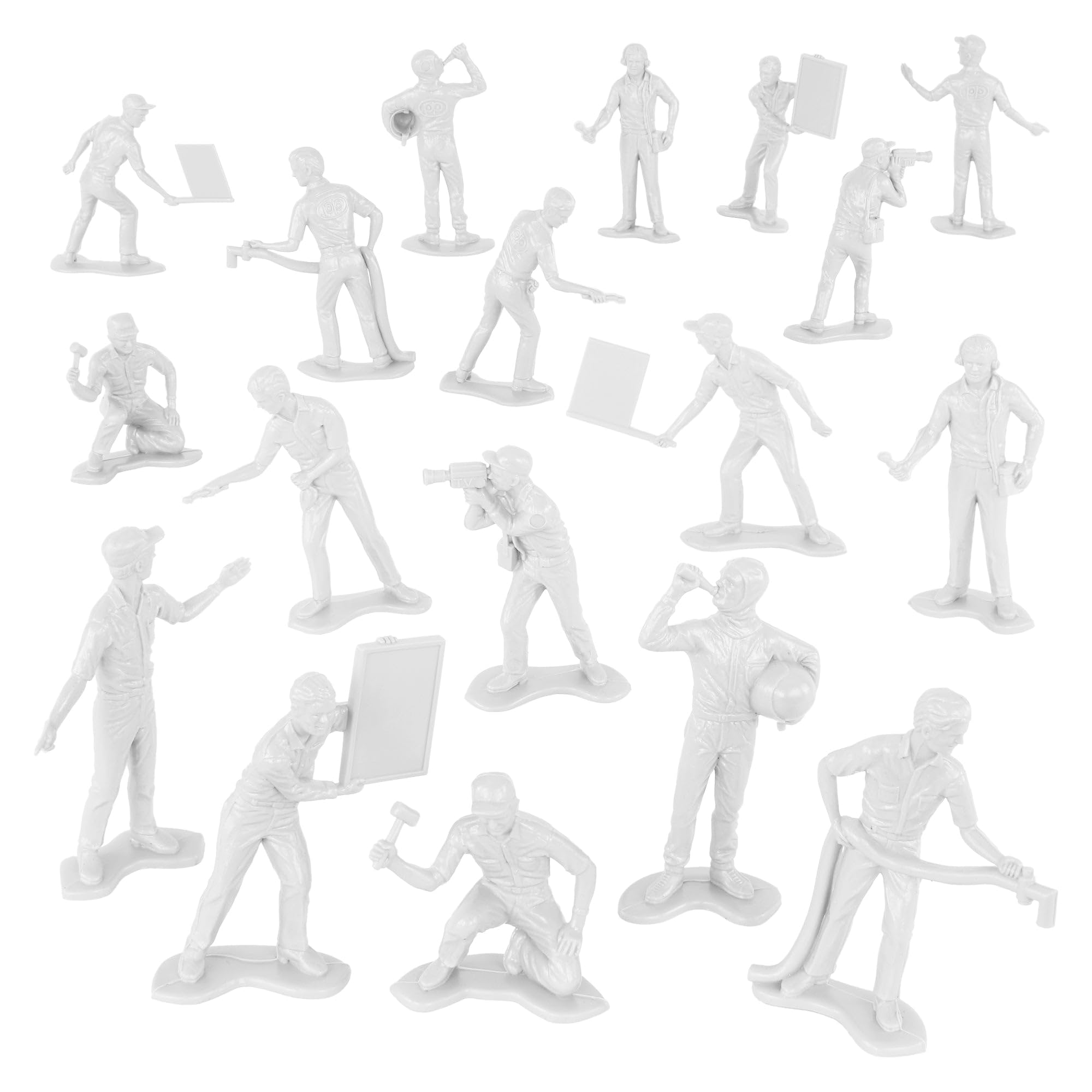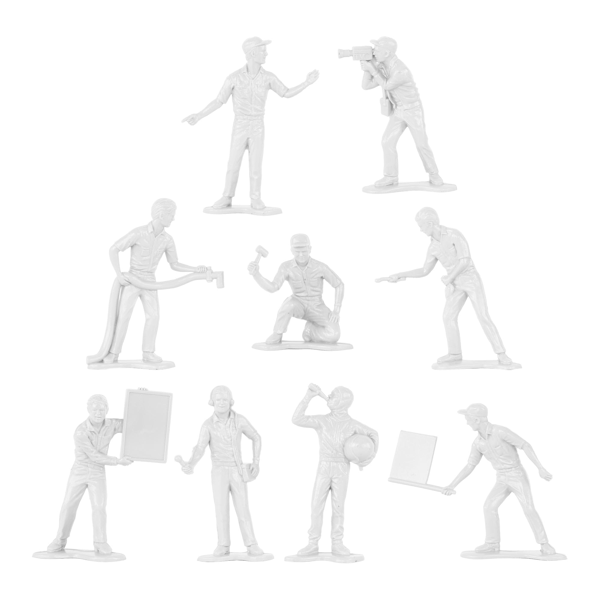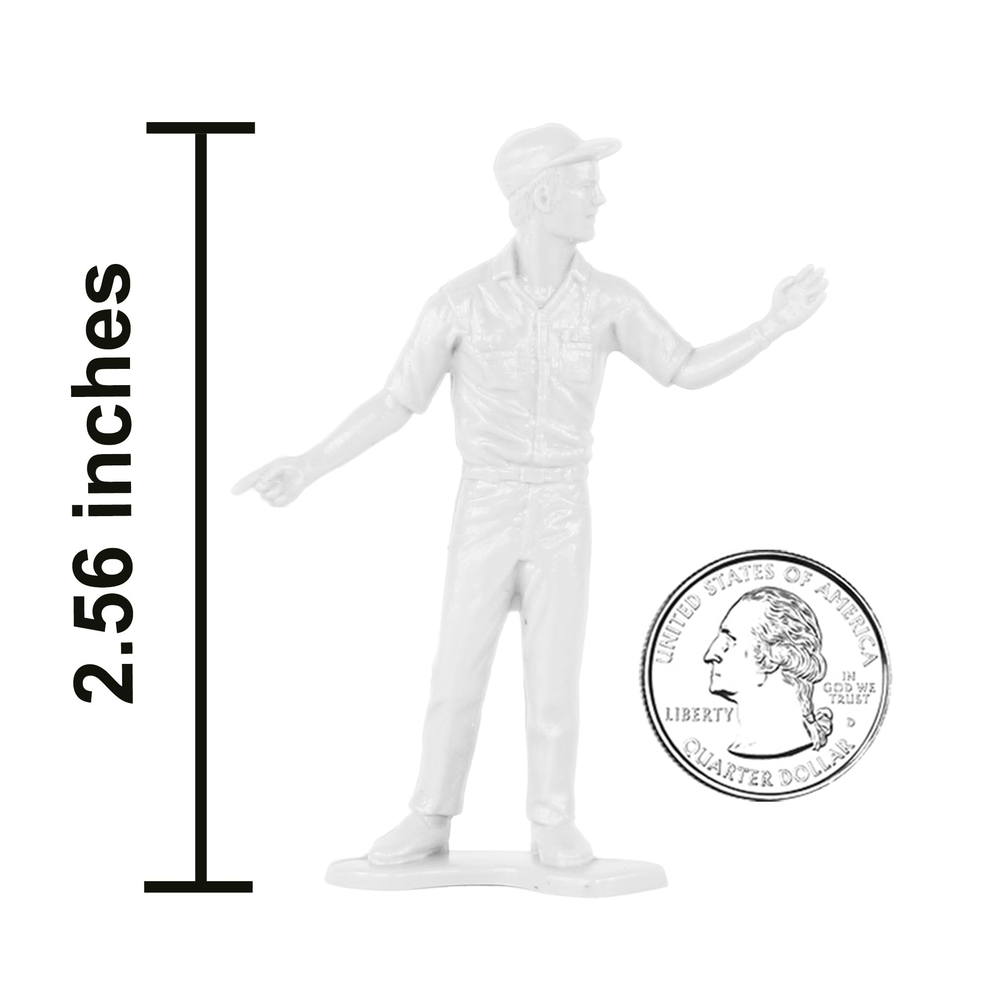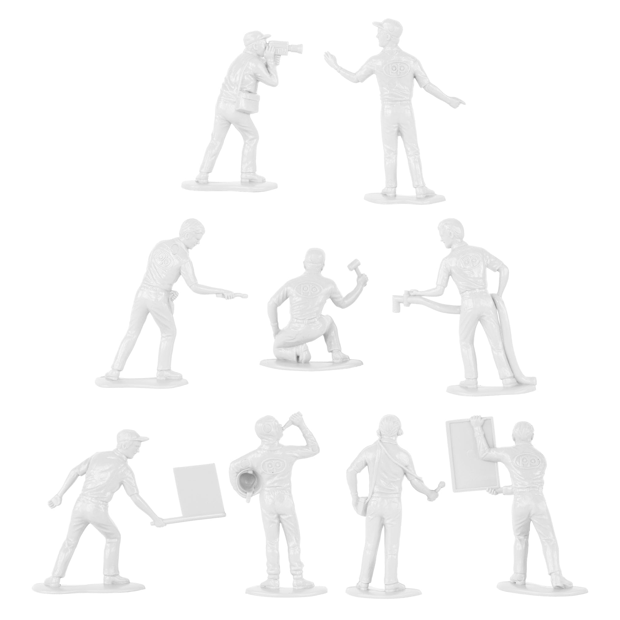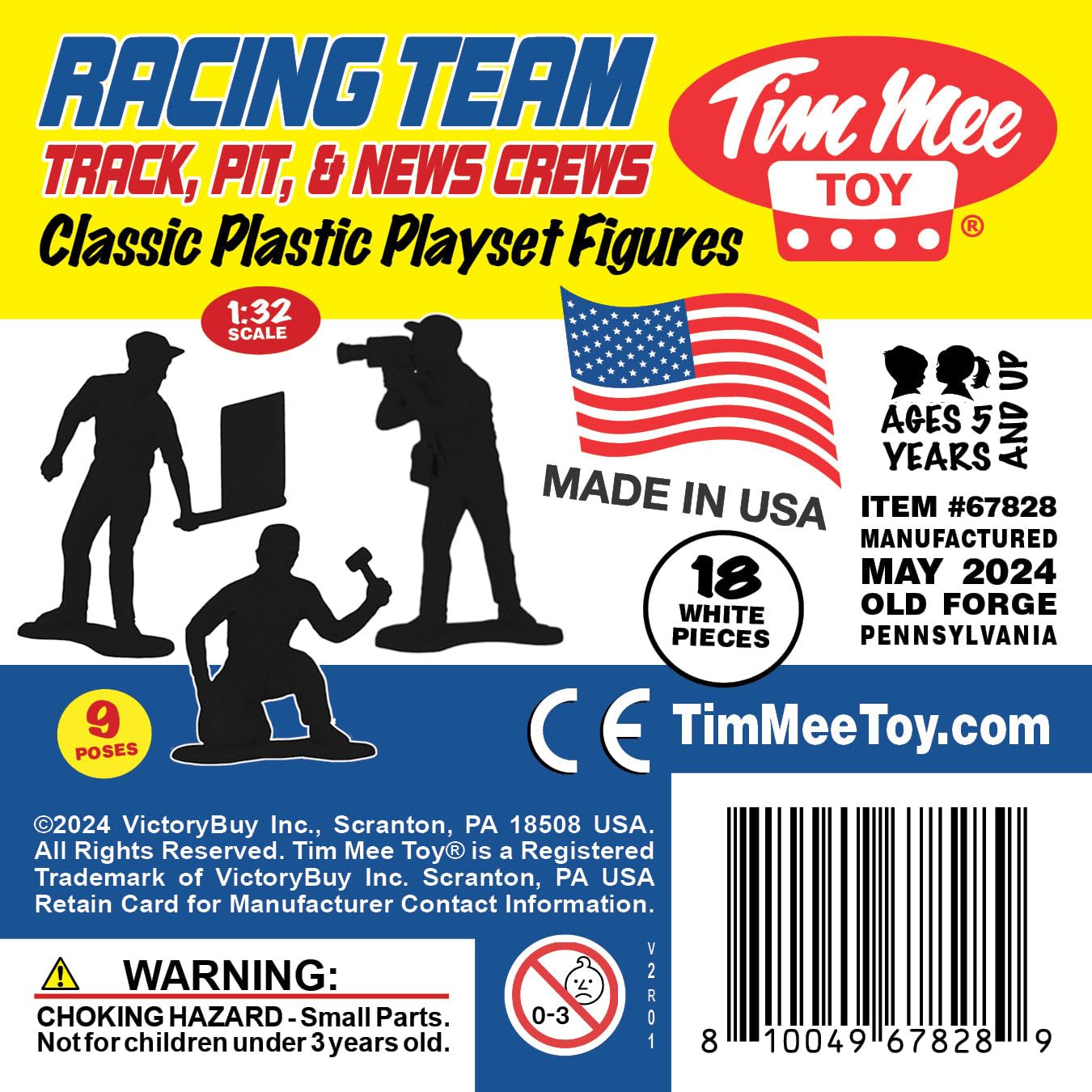 The Tim Mee Toy Racing Team is ready for the track. This 18 piece Set of is proudly manufactured in the United States, and includes 18 white figures in 9 poses for maximum play value. Features driver, mechanics, track crew, and even a film and sound crew. Figures stand up to 2.5 inches tall and are approximately 1:32 scale. Made from slightly flexible LDPE plastic with medium detail, and a little flashing. Originally produced around 1966 by Processed Plastic Co. (Tim Mee Toy's parent company at the time). These figures were initially offered as Speedway Pit Stop Indy Car Racing and later branded as NASCAR. They were usually plastic injection tooled in Red, White and White colors and often included with race cars as well as separately in a bag with a traffic cone. These are real plastic toys, meant to be set up, knocked down, picked up and played with for years to come. Packed in clear bag with insert card and recommended for ages 5 and up.
