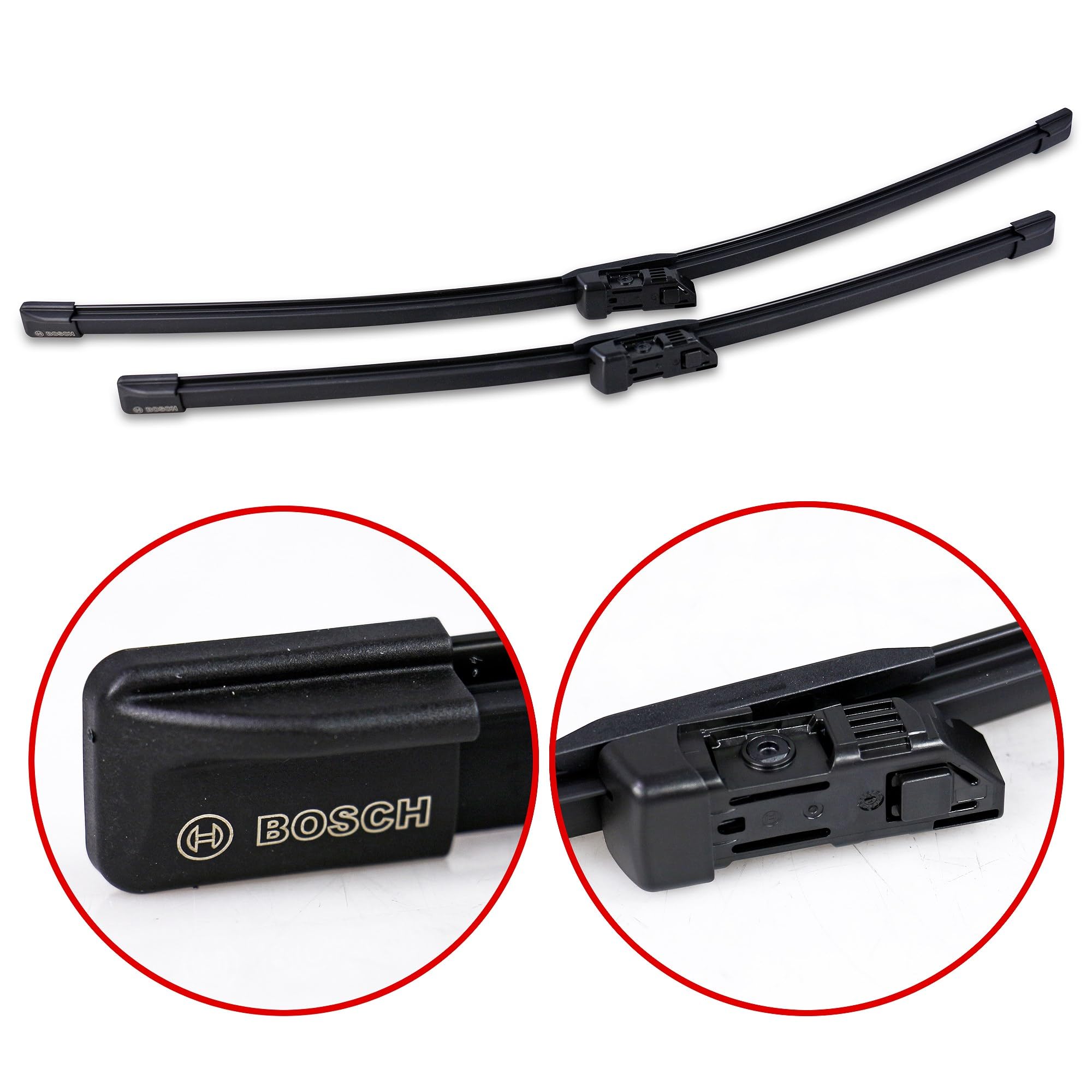 Bosch AeroTwin's patented beam design contains no metal or plastic brackets, joints or hinges, offering an ideal technology upgrade for vehicles originally fitted with conventional wiper blades. The specially blended dual rubber compound with graphite coating removes even the smallest traces of water for exceptional all-weather visibility and smooth, quiet operation. Specific beam curvature for OE specialty wiper arm types, coupled with dual precision-tensioned steel springs, ensures uniform pressure along the entire blade length for crystal clear visibility. Built-in asymmetrical wind spoiler uses air flow to increase blade-to-windshield contact - for consistent performance at highway speeds. Wind spoiler also serves to protect the tension springs from damage by severe weather elements for increased durability and long life. Pre-assembled OE style adapter provides OE fit and function for simple, easy installation on specific vehicles. Set of 2. Note: AeroTwin wiper blades are designed to fit vehicles with specific wiper arm connnection types - they are not universal fit wiper blades. Please verify specific vehicle fitment details with fit checker above.