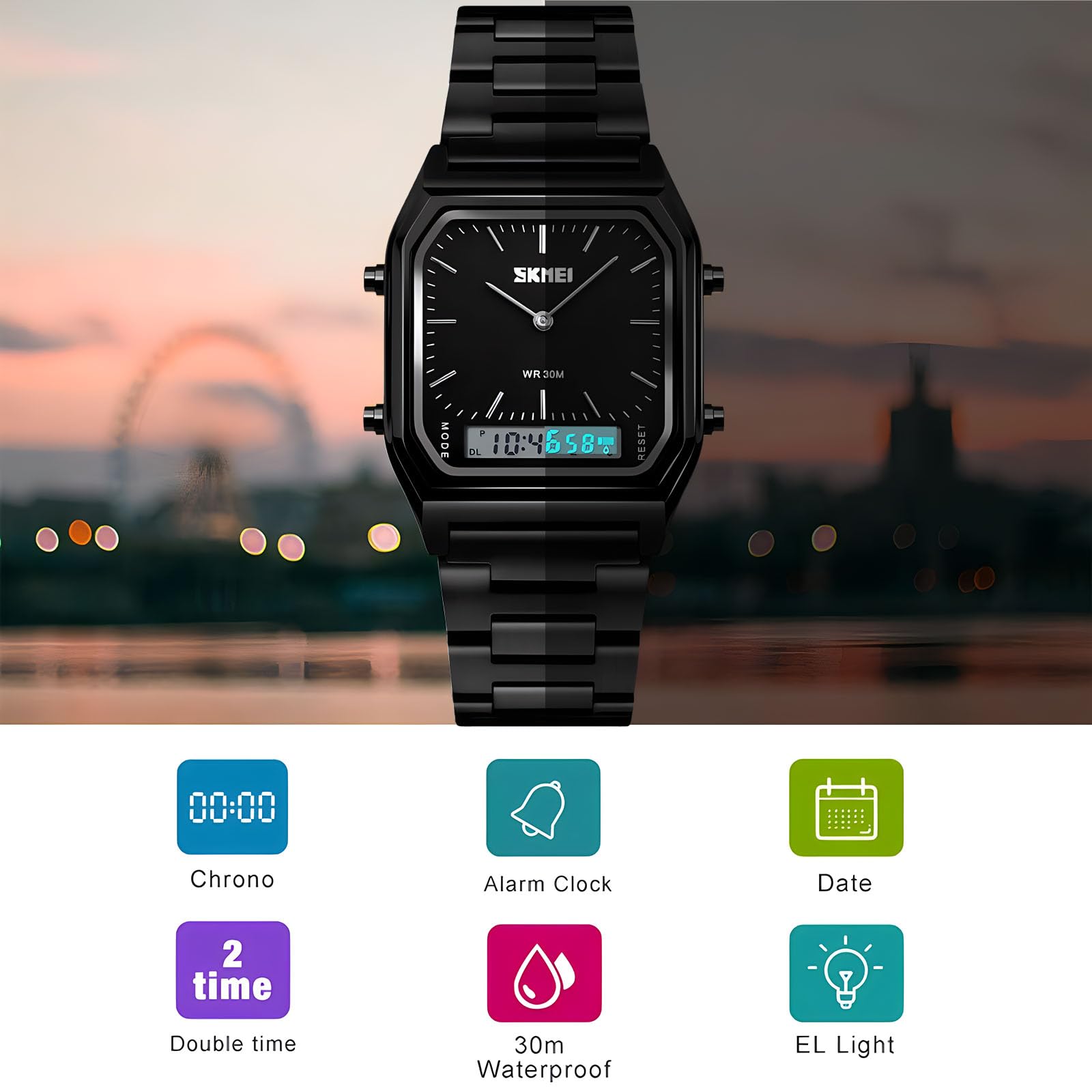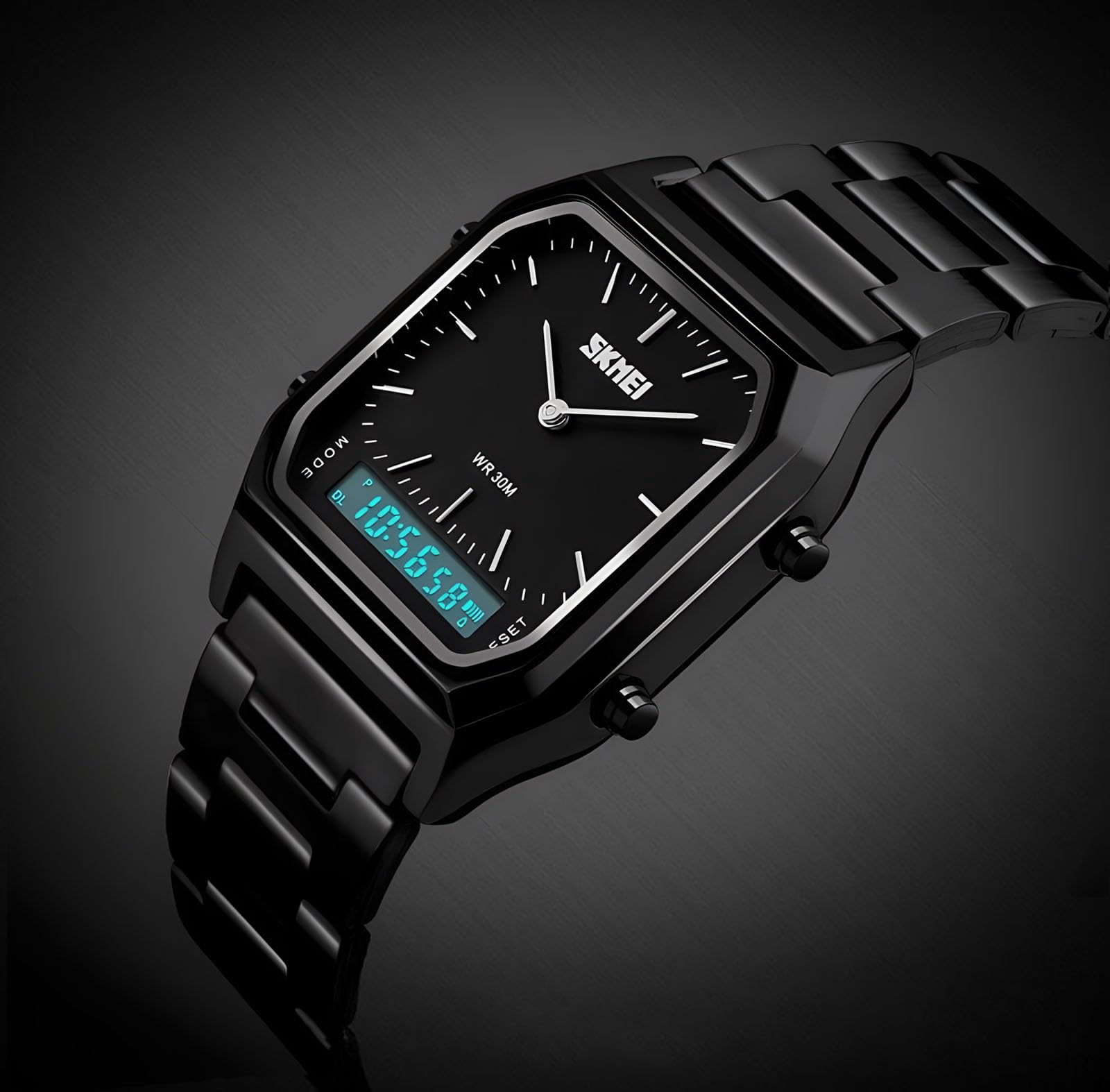 Description Gender: Men Style: Simple,Fashion,Sport Taiwan IC movement Colors: Rose Gold,Gold,Silver,Blue,Black Case Material: Zinc Alloy Band Material: Stainless Steel Strap Buckle type: Buckle Watch of Dial: square Dial Diameter: 33mm Case Thickness: 11mm Band Width: 22mm Water Resistance Depth: 30ATM Functions:Dual Display,EL Light,Date,Chronograph,Alarm Features:Double Display,Digital Quartz Watch,Waterproof