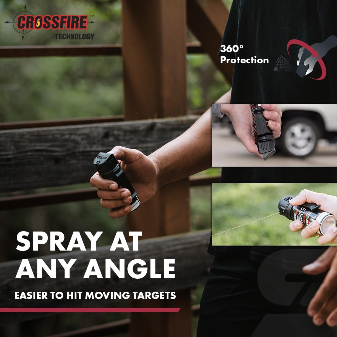 MAXIMIZES TARGET ACQUISITION: Crossfire technology allows the pepper gel to be sprayed at any angle, even upside down, for better, more dependable and accurate protection against moving threats. Fast Flip Top safety is quicker & easier to use.