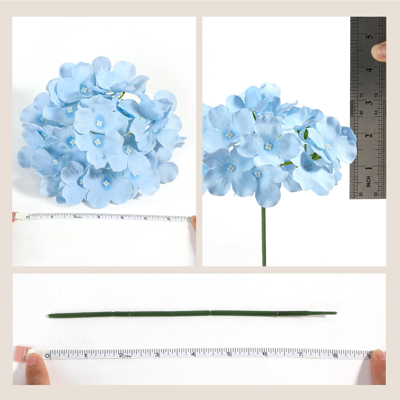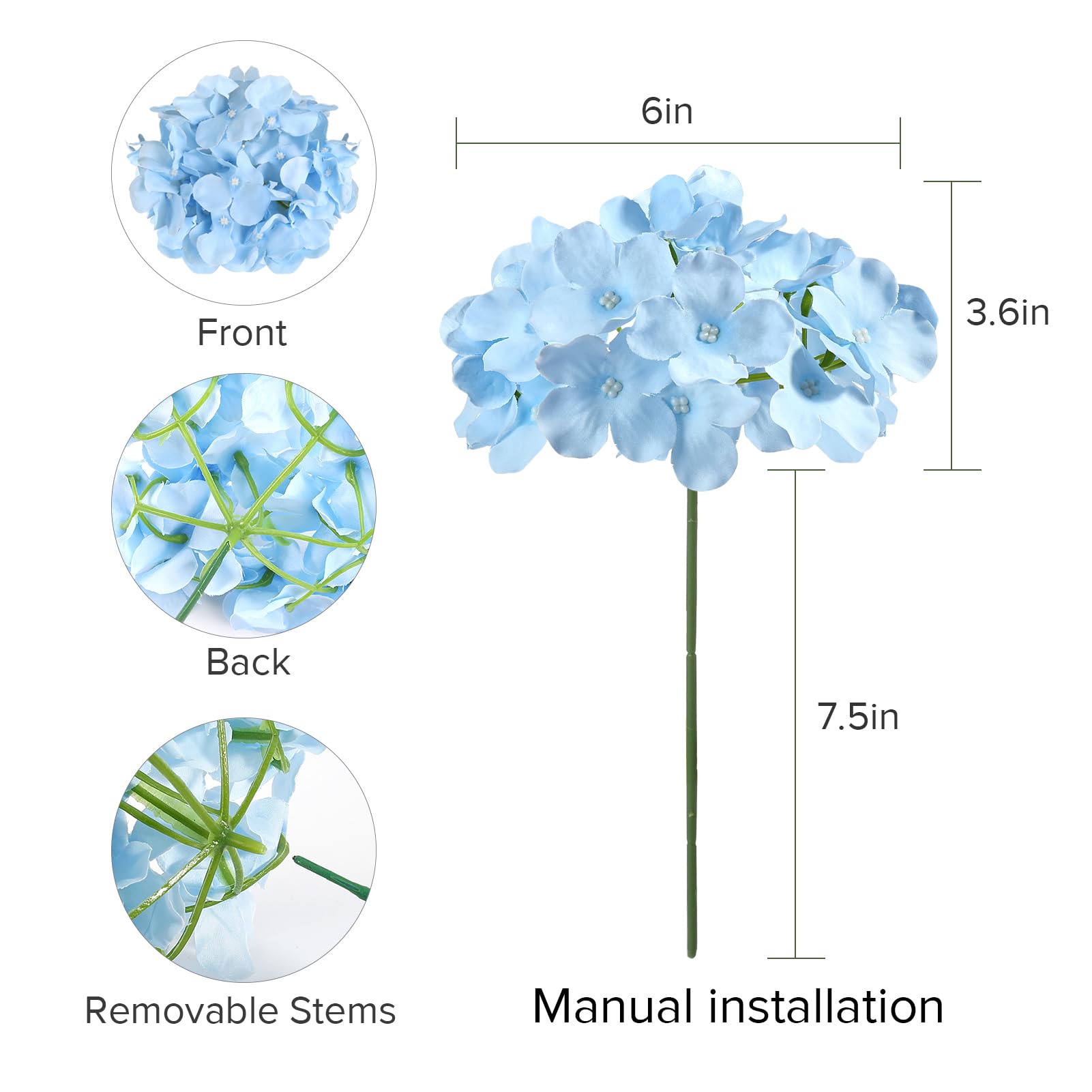Size & Material: Hydrangea head diameter is about 6 inches, height is about 3.6 inches, made from silk cloth and plastic; Independent stem length is about 8 inches, made of plastic with iron wire inside, can be bent or cut freely to match any decor style or occasion