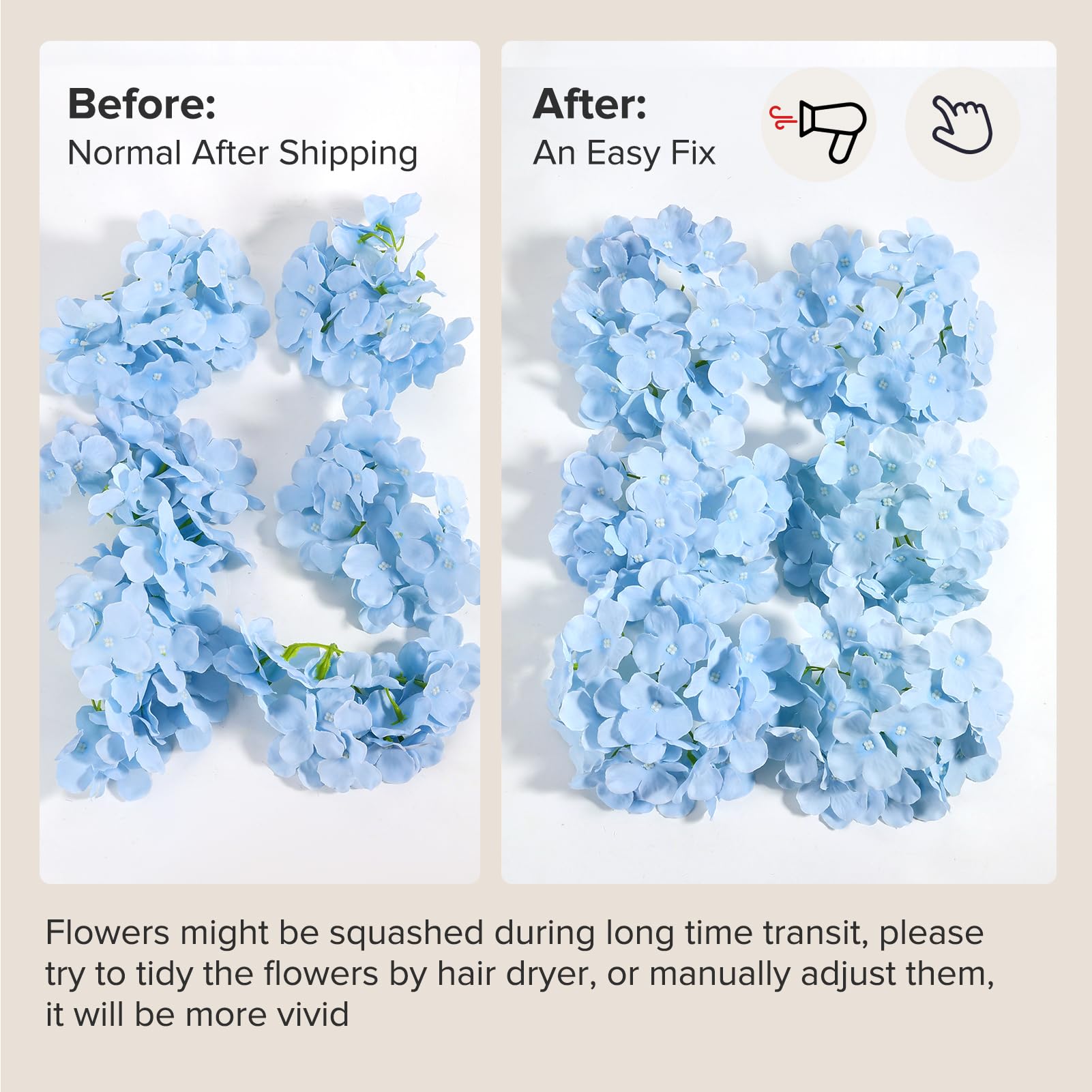 NOTE: Flowers might be squashed during long transit, please try to tidy the flowers with a hair dryer, or manually adjust them, it will be more vivid