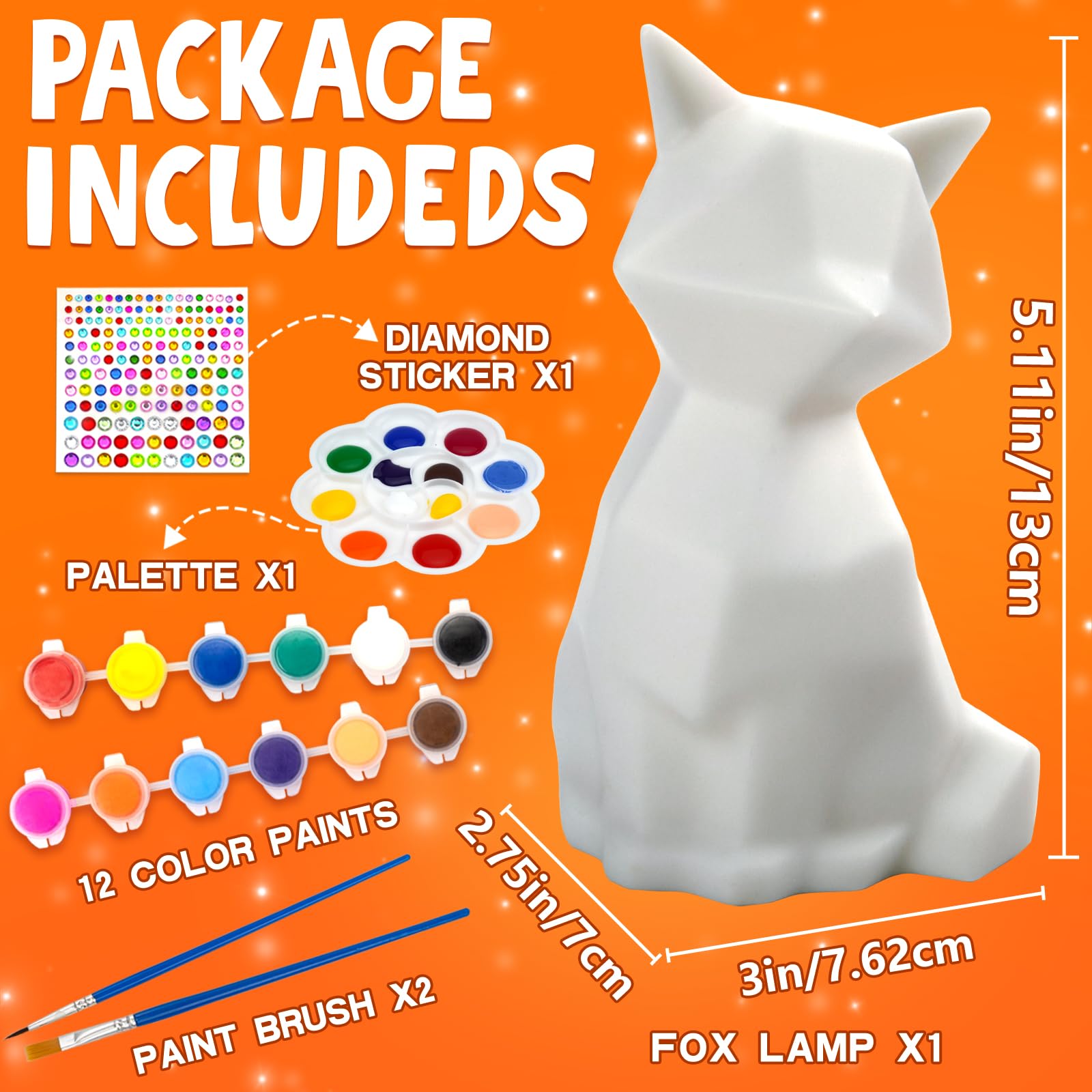All-Inclusive Kit: This painting foxlamp kits for kids ages 4-6, come with foxlamp, plastic base, 12 paint pots, 2 paint brushes, 1 gem sticker, includes everything they need to create their own foxnight light. A fun craft activity for all ages—add a personal touch to your room with our fox lamp crafts kit.