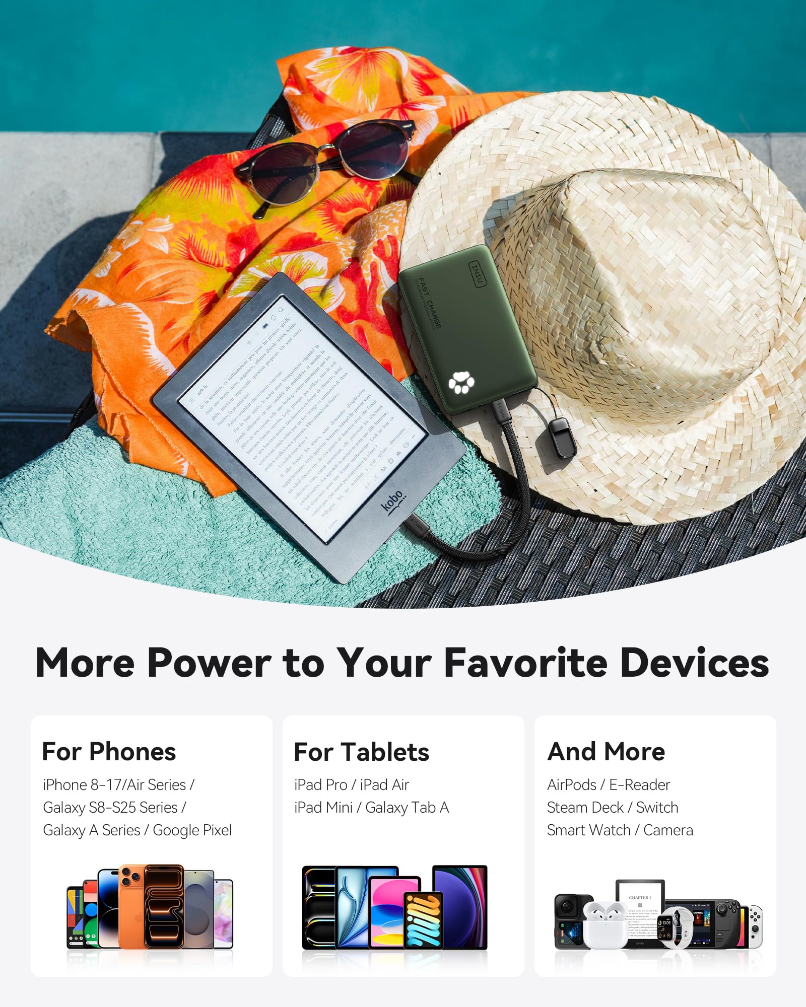 What You Get: INIU 10000mAh portable charger*1, 0.12M/0.4ft Lanyard USB-C to USB-C Cable*1, user manual*1, and Industry-Leading 3-Year INIU Care, plus Lifetime Technical Support.