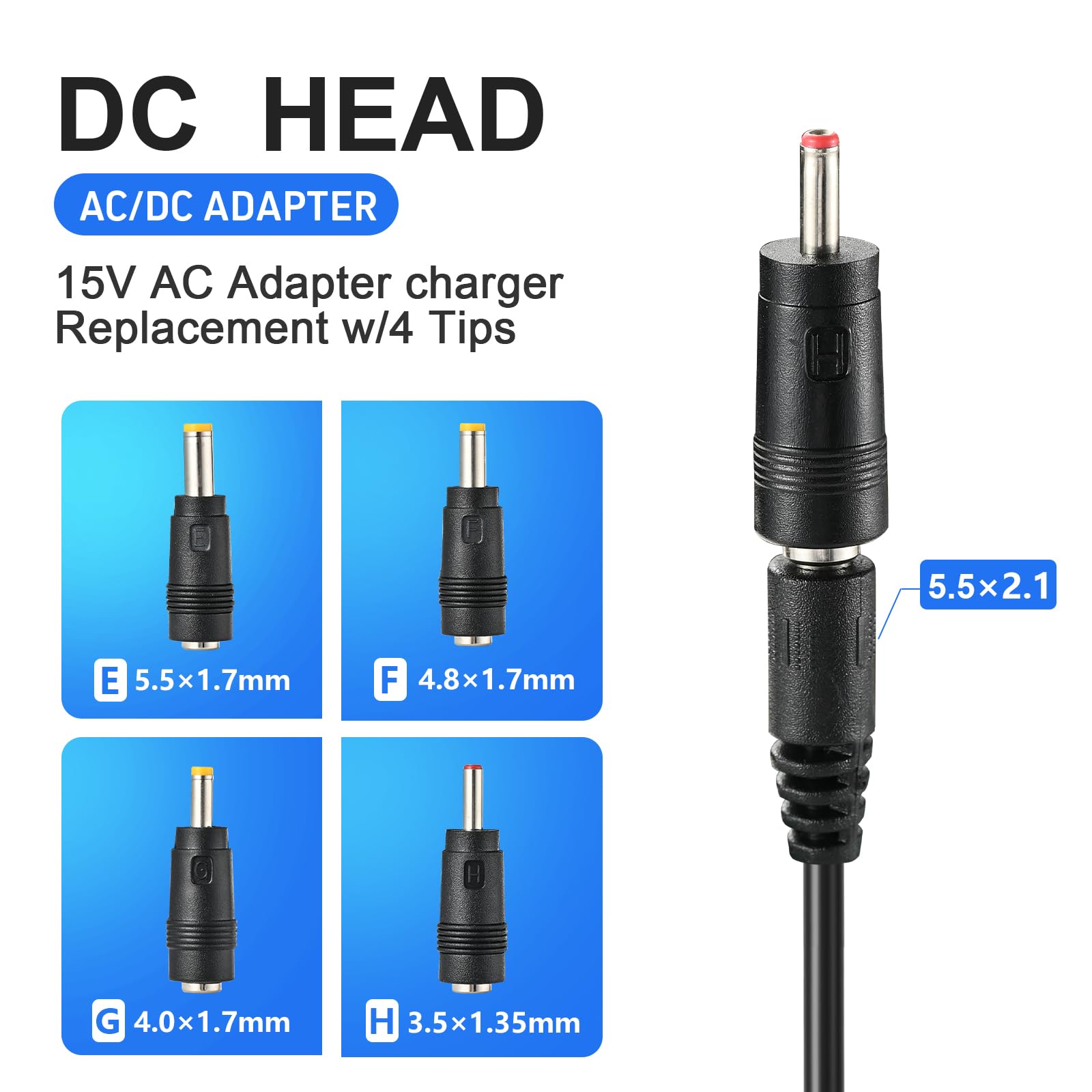 Product Feature: Input:100-240V 50-60Hz DC Output: 15V 1A DC Plug Polarity: inner Positive(+), outer Negative(-). DC Cable Length: about 1.5 M / 59 inch DC Plug Size: 5.5x2.5mm tip (inside"+", outside"-"), 4 Adapter Plugs Size: F: 4.8*1.7mm. G: 4.0*1.7mm. H: 3.5*1.35mm. X: 2.5*0.7mm. Package: 1 x 15V 1A Universal power adapter 4 x DC adapter Plugs