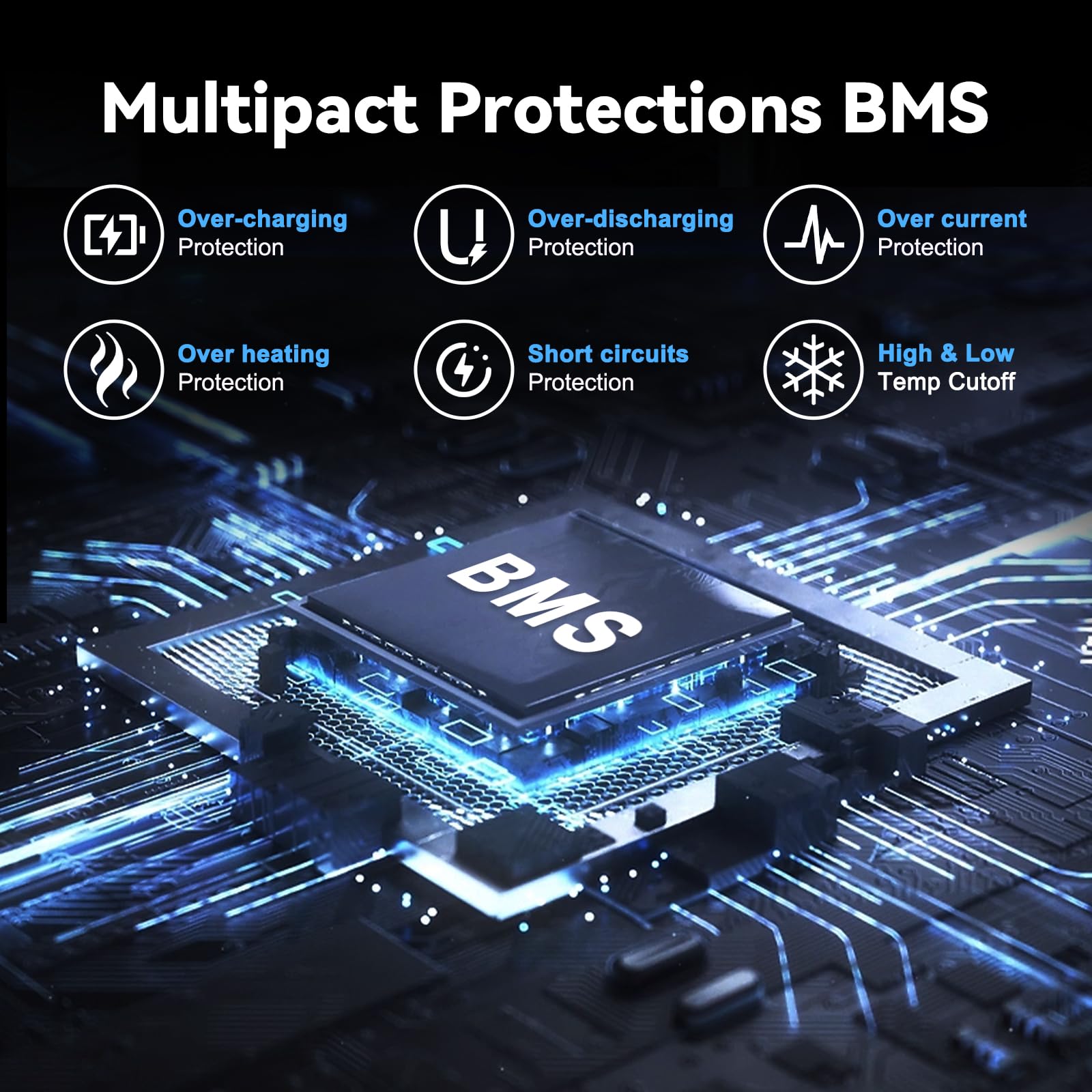 🍃Built-in BMS Protection: The LiFePO4 battery incorporates a built-in 100A BMS protection plate that automatically disconnects the battery if the discharge current exceeds 300±50A. This intelligent design ensures optimal safety for the battery.