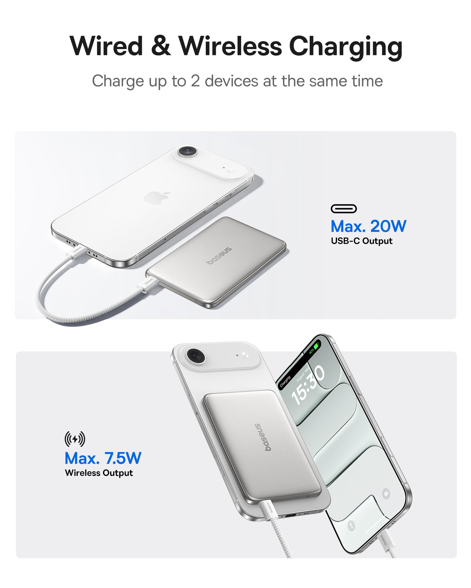 đĄăUltra-Slim Profile, Feather-Light Portabilityă: Experience unmatched convenience with Baseus magsafe power bank. Boasting an ultra-thin 0.3-inch profile and a mere 3.8oz weight even lighter than your iPhone, this charger redefines portability. This magnetic phone charger slides effortlessly into your pocket, handbag, or even wallet; its slim design ensures it stays out of your way until you need a quick power boost. Whatâs more, its edges feature upgraded precision polishing craftsmanship, delivering a smoother, more refined touch that complements the enhanced aluminum alloy shell.