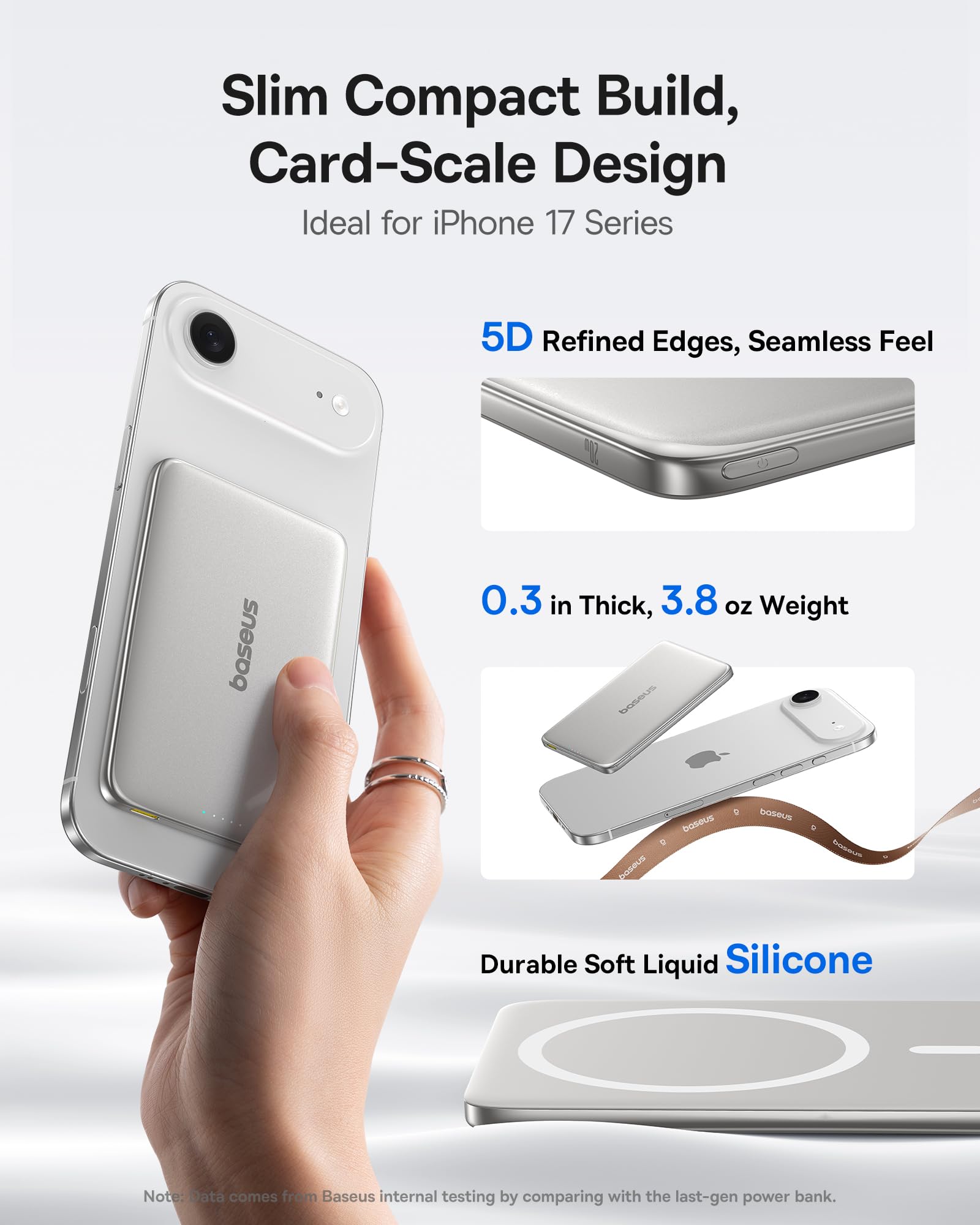 đ˘ăMeticulously Refined Every Detailă: The magsafe portable charger enhanced aluminum alloy shell, coupled with the polished edge craftsmanship. The result? A luxurious tactile experience: a silky, soft touch that feels refined in your palm, no rough edges or cheap textures. Its nano-coated silicone surface adds water resistance, keeps fingerprints at bay. The ergonomic 5D curved design fits the new iPhone 17 series like a glove, ensuring a comfortable grip. With precision-engineered dimensions, it never protrudes beyond your phone, blending seamlessly as if itâs part of the device itself.