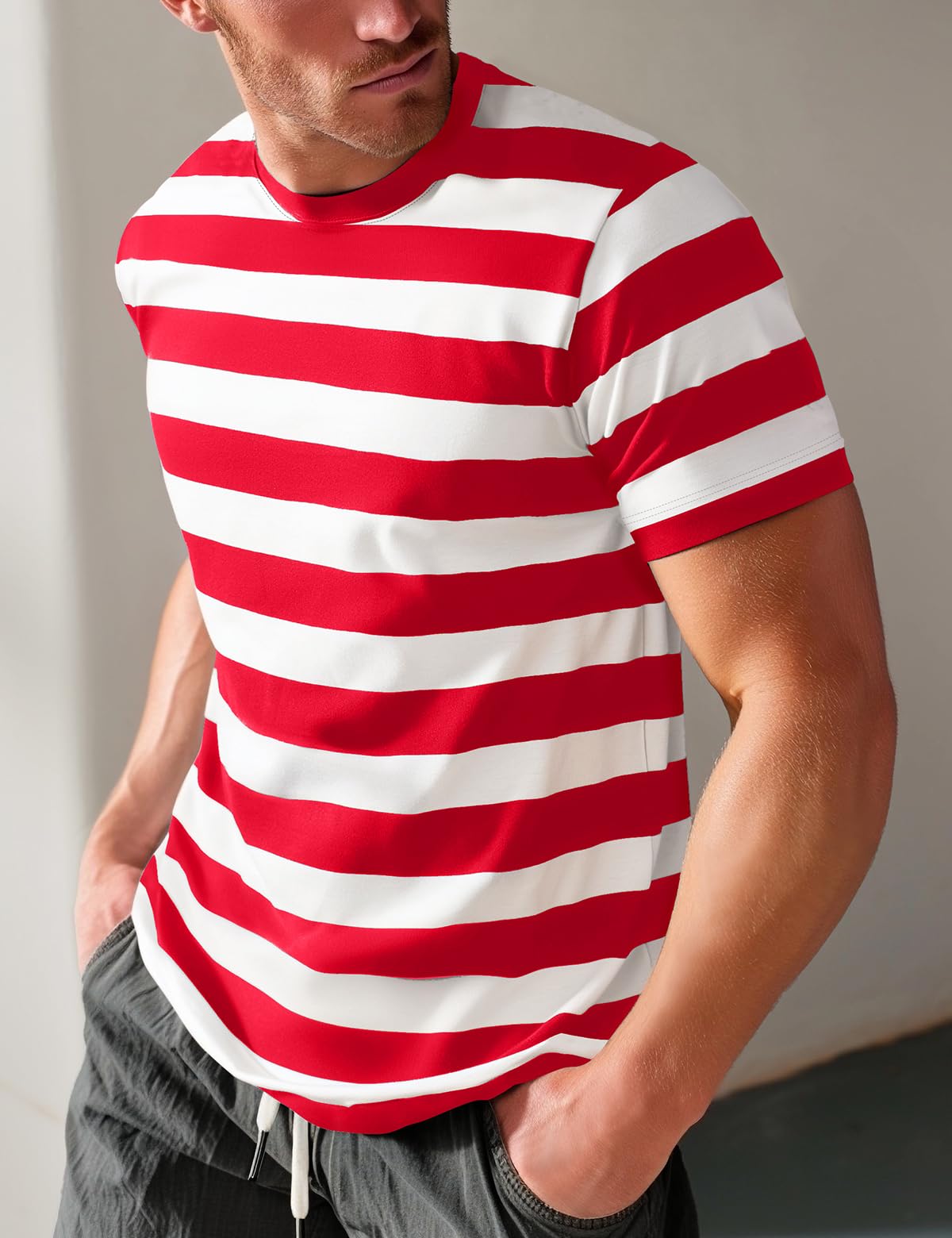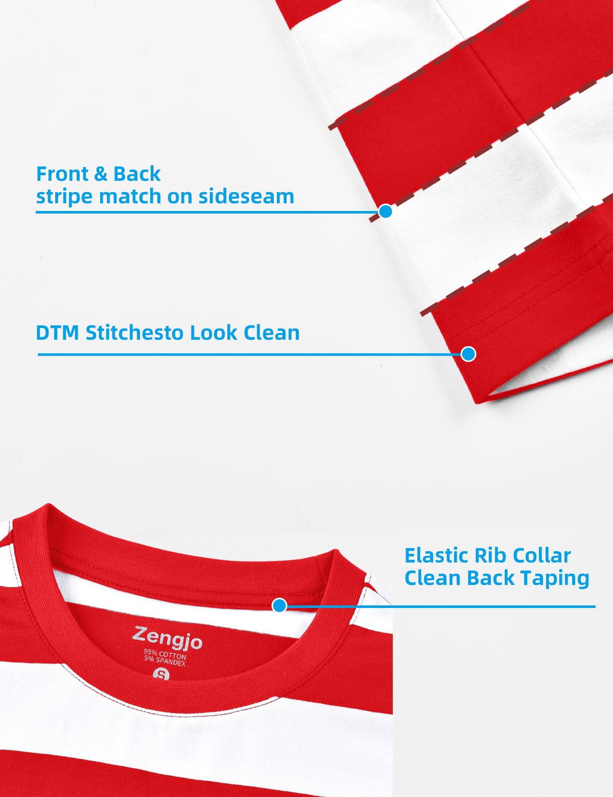 Details: Pull on closure,stretch Rib collar for deformation resistant. Horizontal stripes alignment on the side seam. Tidy stitches on the stipes.