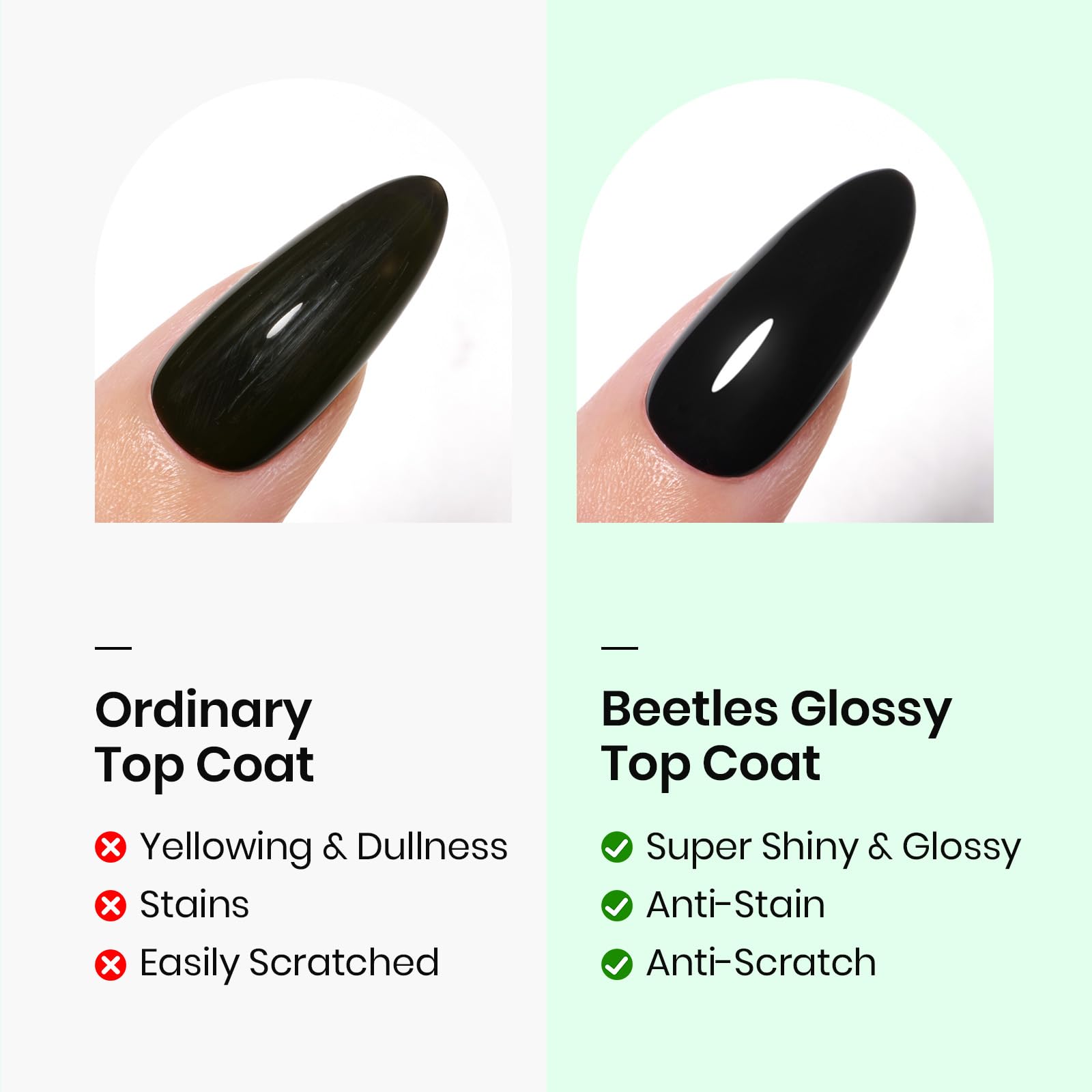 Beetles Extra Glossy Top Coat: Compared with ordinary top coat gel nail polish, upgraded super shiny gel nail polish top coat is effective against stains, more abrasion-resistant, smoother, and able to resist scratches, leaving the nail surface smooth and looking brighter. UV/LED Lamp Needed, Tips: Avoid touching your nails after curing the top coat for 2 minutes to enhance the shine.