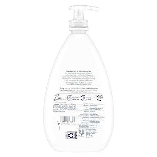 Rich moisture: Baby Dove Rich Moisture Hypoallergenic Body Lotion (20 oz.) gently nourishes and hydrates baby's sensitive skin after bath time, leaving it moisturized for 24 hours