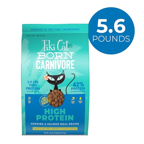Tiki Cat Born Carnivore High Protein Dry Cat Food gives cats the meat they need with the delicious flavors they love. This baked, dry kibble is bursting with protein from real, high-quality herring along with herring & salmon meal to satisfy your cat's cravings at mealtime. Grain free, low carb, and packed with nutrient-rich ingredients to provide a complete & balanced meal for your feline friend. Tiki Cat is designed with the highest standards in nutrition to keep cats in optimal health, and you can see it in every bowl.