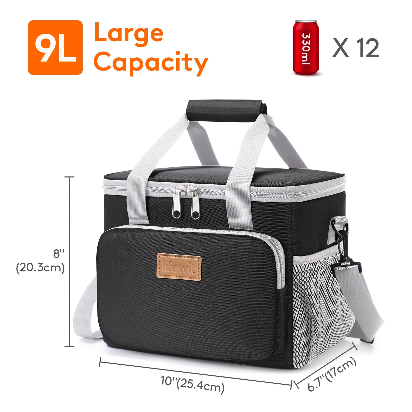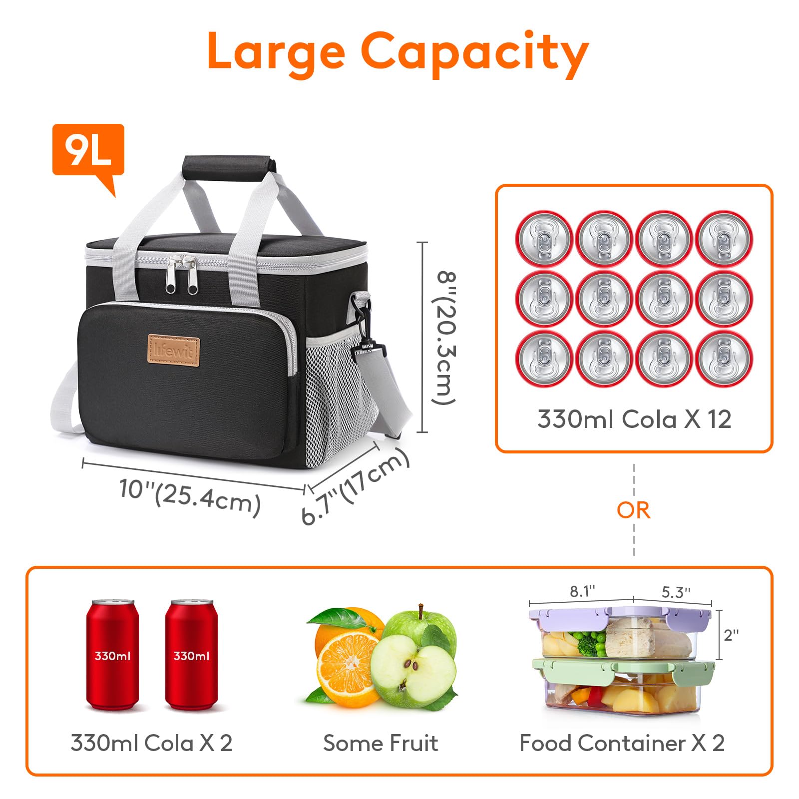Large Capacity: Dimensions - 10" ( 25.4cm ) × 6.7" ( 17cm ) × 8" ( 20.3cm ). The maximum capacity of lunchbox for adults is 9L, and is spacious enough to store 12 cans of coke (330ml), or your lunch such as sandwiches, salad, snacks, drinks and fruits and so on. It is suitable for office, for work, picnic, beach, trip.