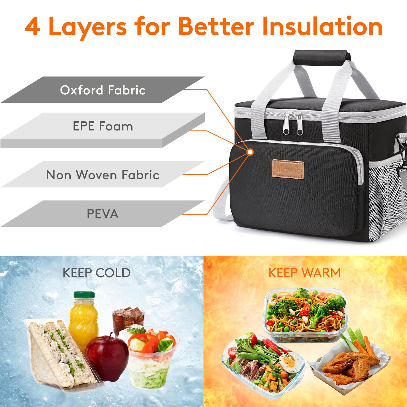 Thermal Insulated: The lunch bag is made of insulated material which can keep food and drinks cool or warm for more than 5 hours. Besides, the interior lining is made of food grade PEVA foil so you can put your food into the bag directly without any worry. The built-in 6mm EPE foam provides great protection to your containers, food and drinks.