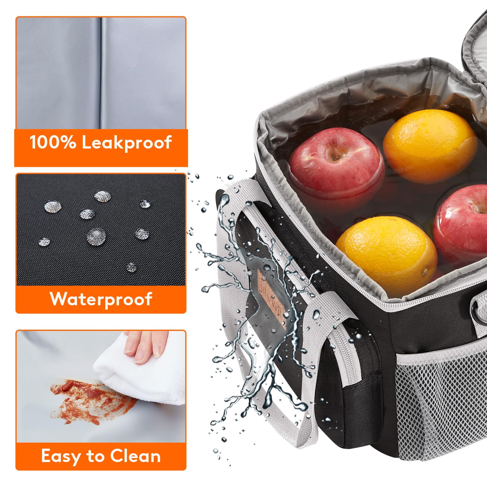 Leakproof & Waterproof: The exterior of lunch box for men is constructed out of 600D water-resistant dirt-proof Oxford fabric for durability and water proofing and easy cleaning. Even when full with water and ice, it holds fruits and drinks well, will not leak at all.