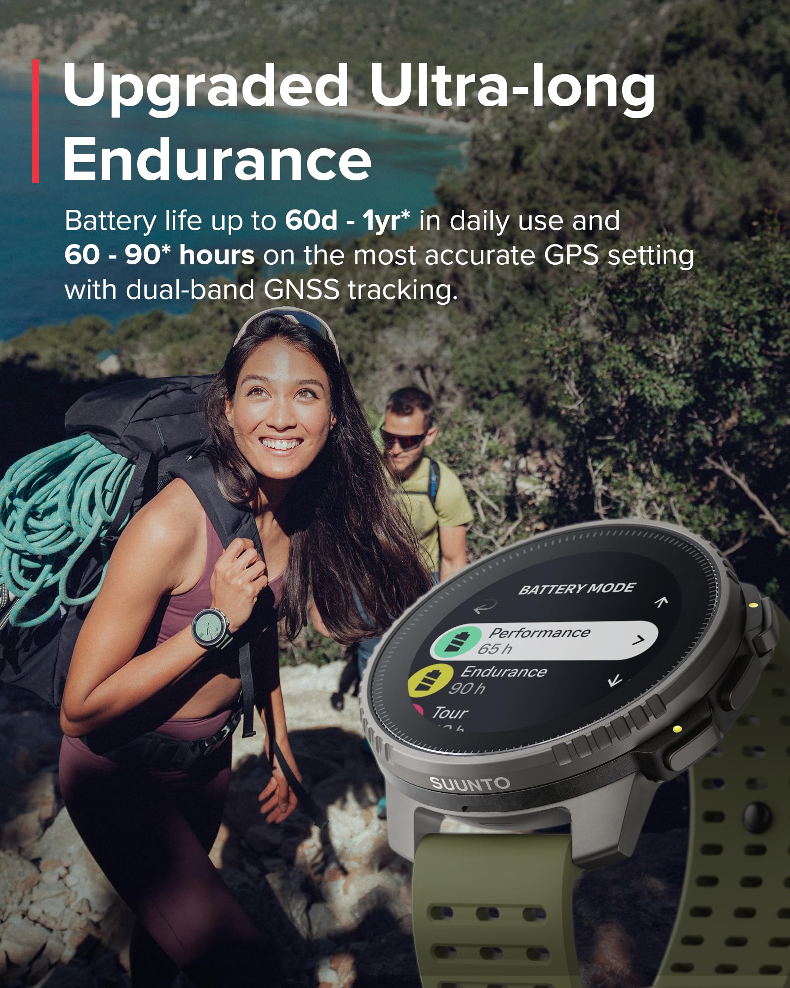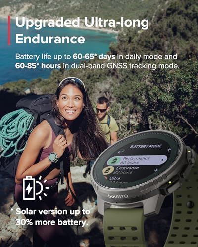 EXTREME BATTERY LIFE: Up to 500 hours of continuous exercise tracking in tour mode & up to 60 hours in the most accurate tracking mode. Boosted a further 30% by solar charging on sunny days (Titanium model only)
