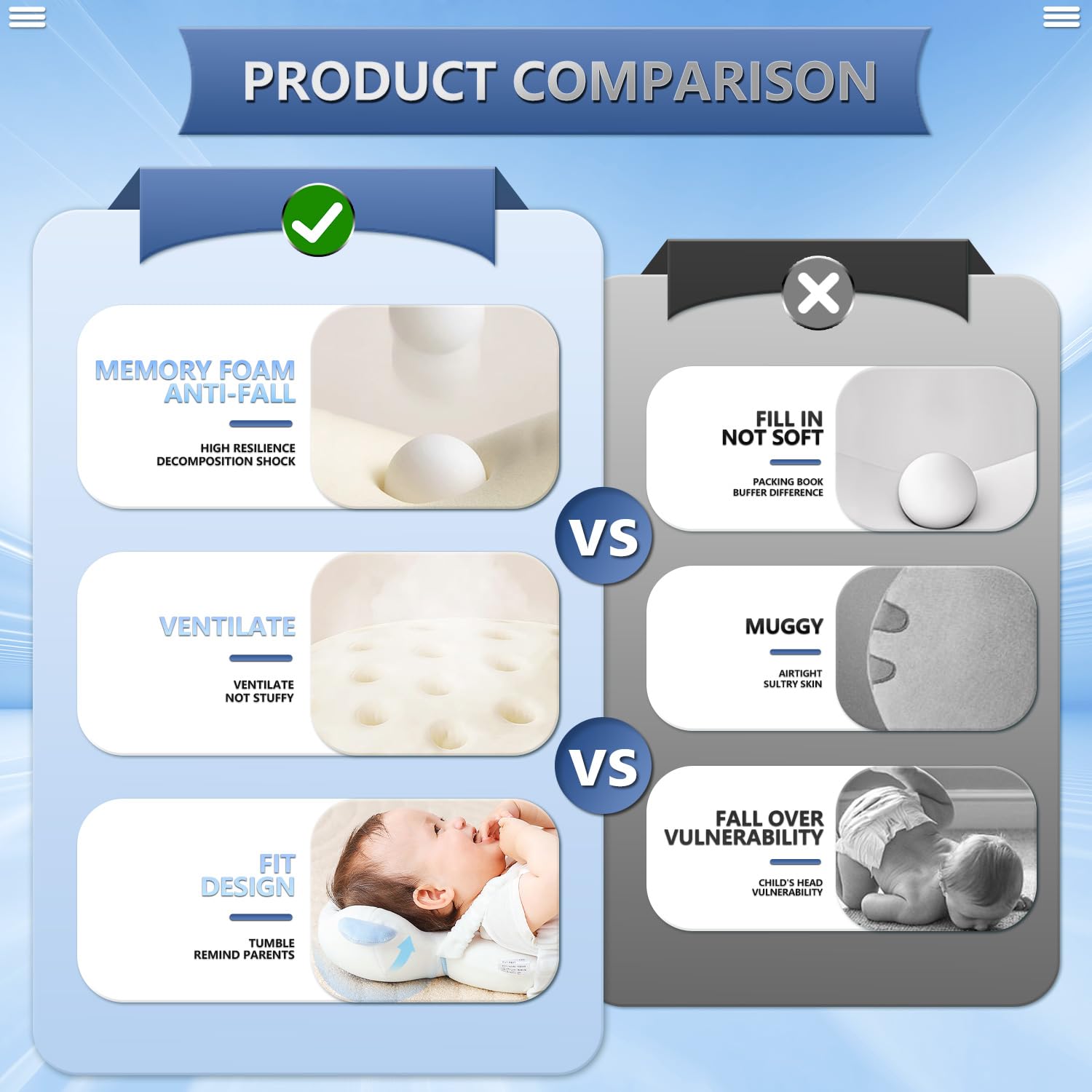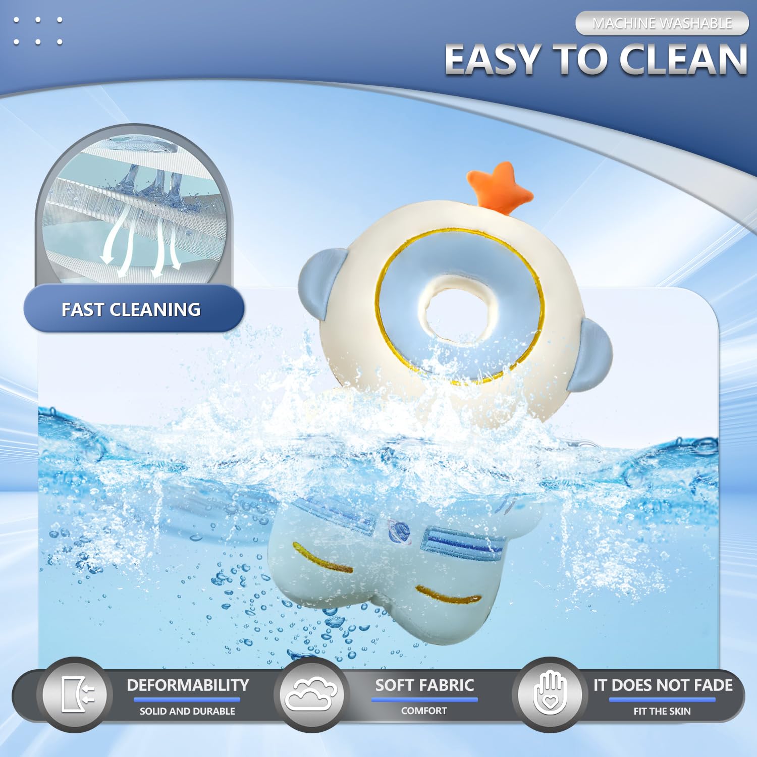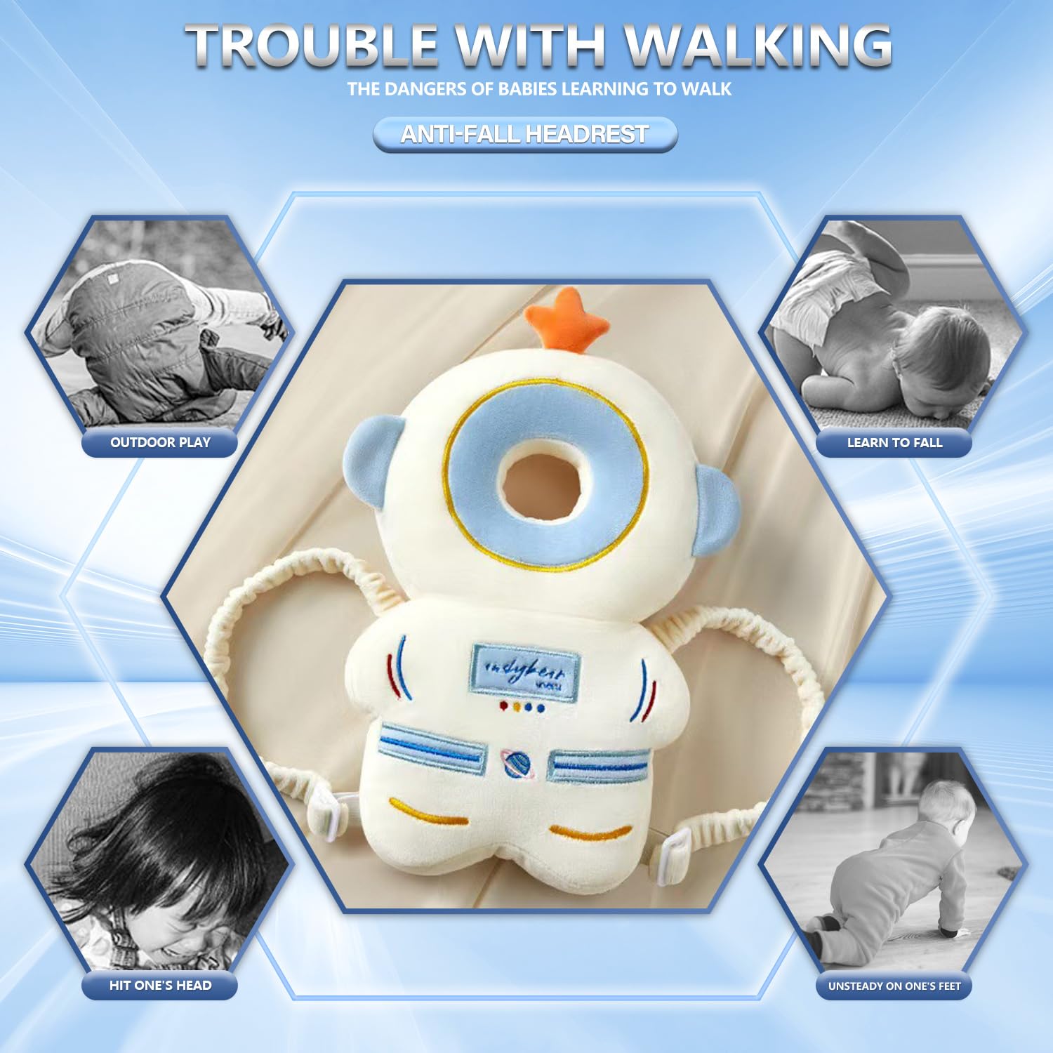 HOLLOW HEAD GROOVE: The hollow shape of the head stabilizes the baby's head; Ensure the head protector will fit the baby in case of fall