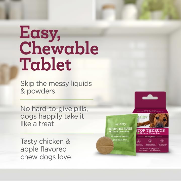 NATURAL DIARRHEA REMEDY – Vetality Stop the Runs helps turn your dogs' stool from loose to firm quickly. Stop the Runs helps relieve your dog’s bloating and gas, indigestion, loose stool, and bowel movements, so they can have more energy and get back to being their happy self.