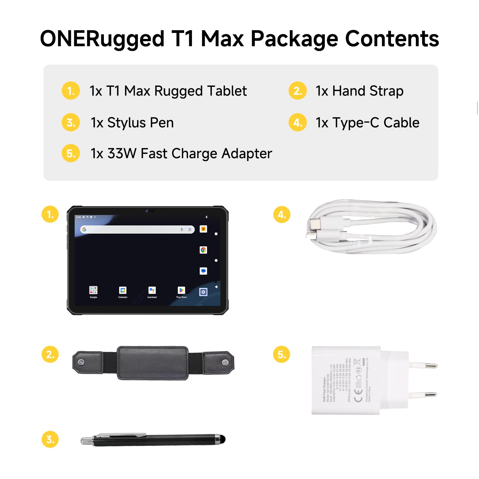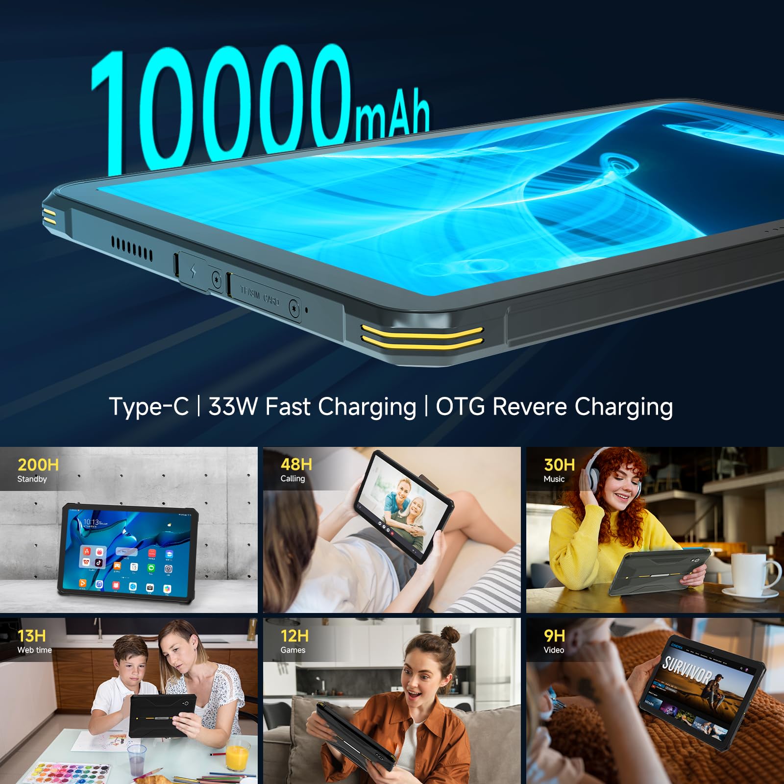 [ 10000mAh Large Battery, 33W fast charging, OTG ] - Powered up with a 10000mAh Large battery, supporting up to 10 hours long-lasting performance ensures that you no longer need to worry about your work being interrupted by a power outage. Equipped with 33W fast charging function, you can charge your tablet quickly.This rugged tablet pc also supports OTG reverse charging, like a large capacity mobile power supply, it can charge your phone or other devices when needed
