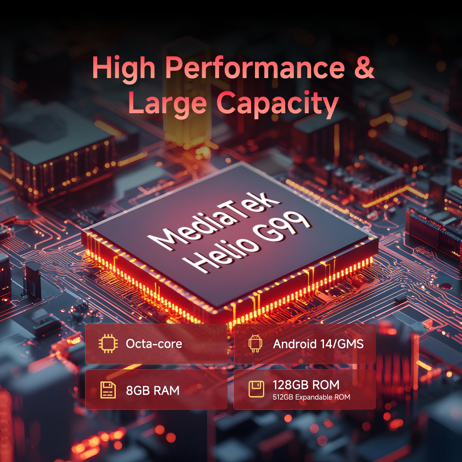[ Impactful Performance ] - Comes with 8GB RAM + 128GB ROM and 512GB TF card expandable storage space. The Large storage can fully meet your daily entertainment and work. It is also boosted with MTK Helio G99 octa-core processor, media and gaming are fast, you won't have any stress multi-tasking, playing and downloading. The newly upgraded Android 14 lets you switch quickly and smoothly between different apps, also protect your privacy