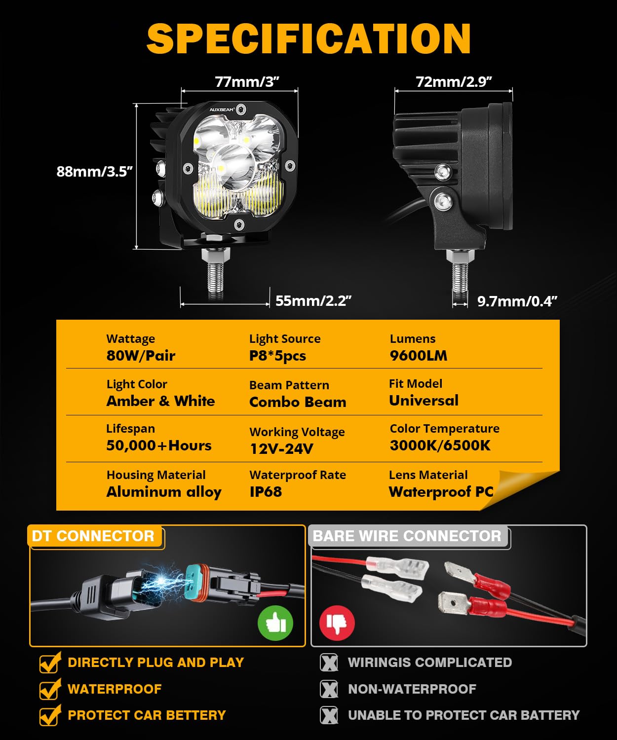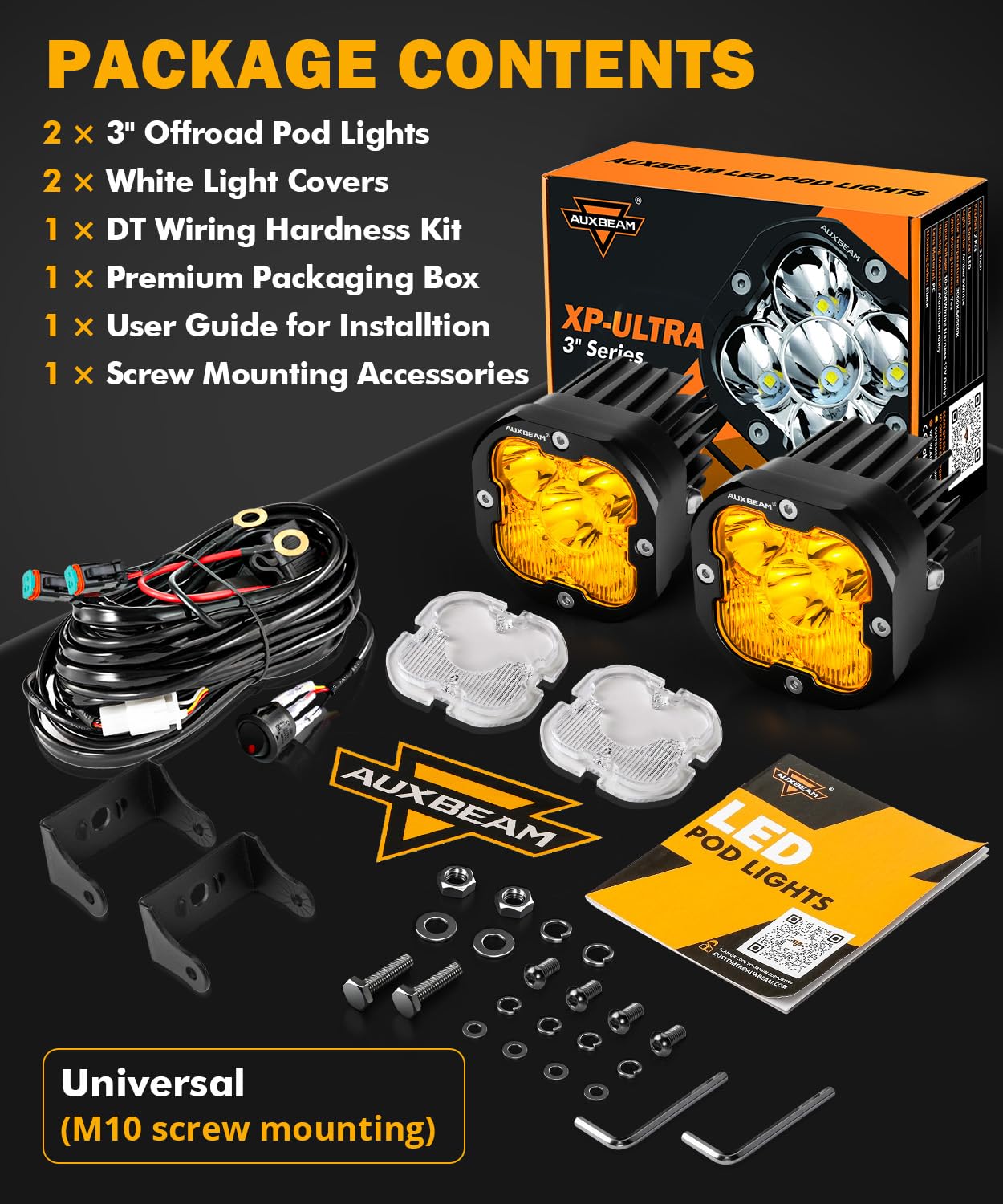 【Buy with Confidence】- 2 x 3 inch pod light, 2 x white light cover, 1 x 10ft DT wiring harness, 1 x installation accessories kit and 1x exquisite package gift box. No need to purchase additional wiring harness or plug. 24-hour after-sales service, please contact Auxbeam customer service at any time.