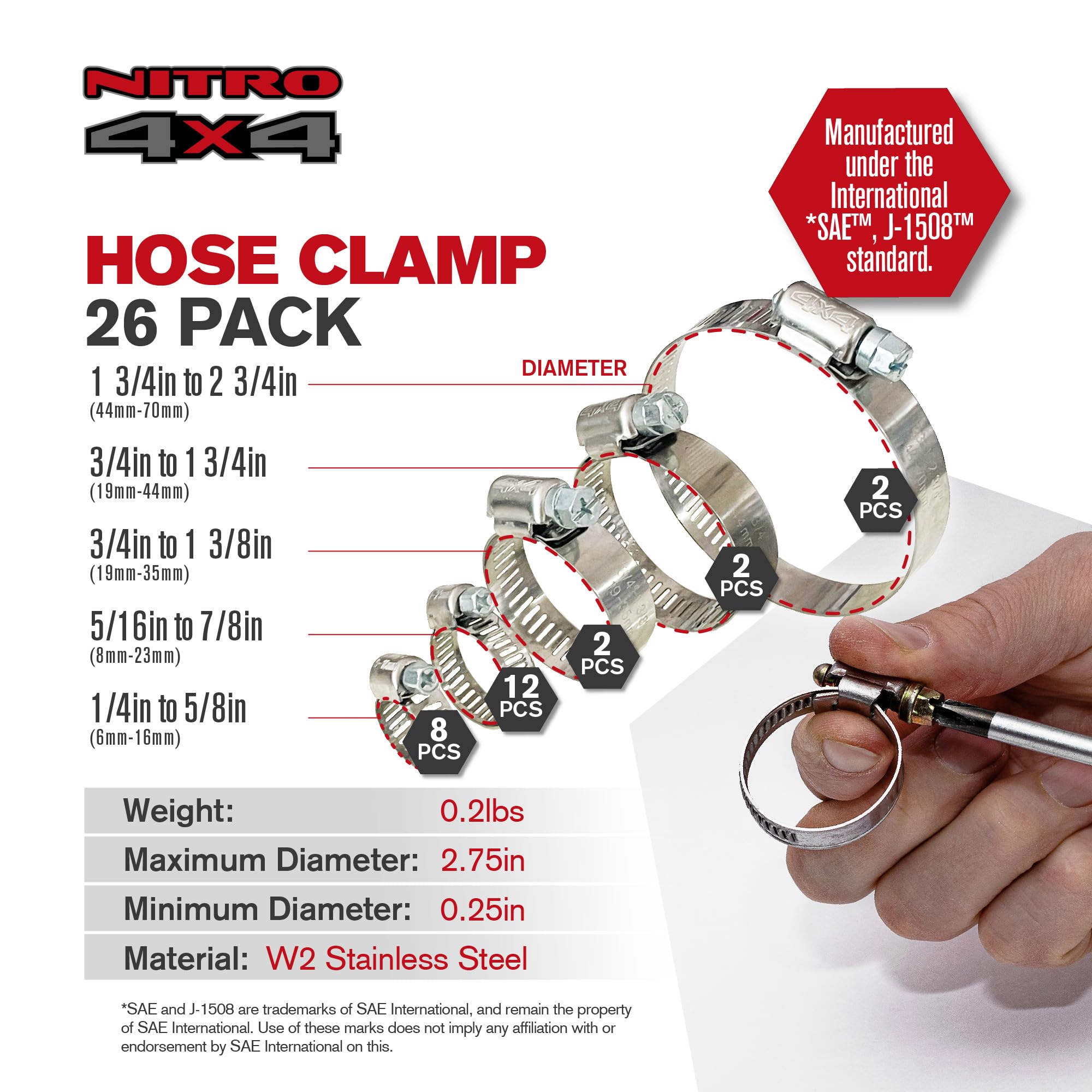 Adjustable Hose Clamp Assortment: Includes clamps with an adjustable range of 1/4in to 2-3/4in (0.25in to 2.75in), with sizes ranging from 1/4in to 5/8in (8 pcs), 5/16in to 7/8in (12 pcs), 3/4in to 1 3/8in (2 pcs), 3/4in to 1 3/4in (2 pcs), and 1 3/4in to 2 3/4in (2 pcs). Ideal for automotive, plumbing, and everyday use, ensuring a secure and precise fit for hoses of different sizes.