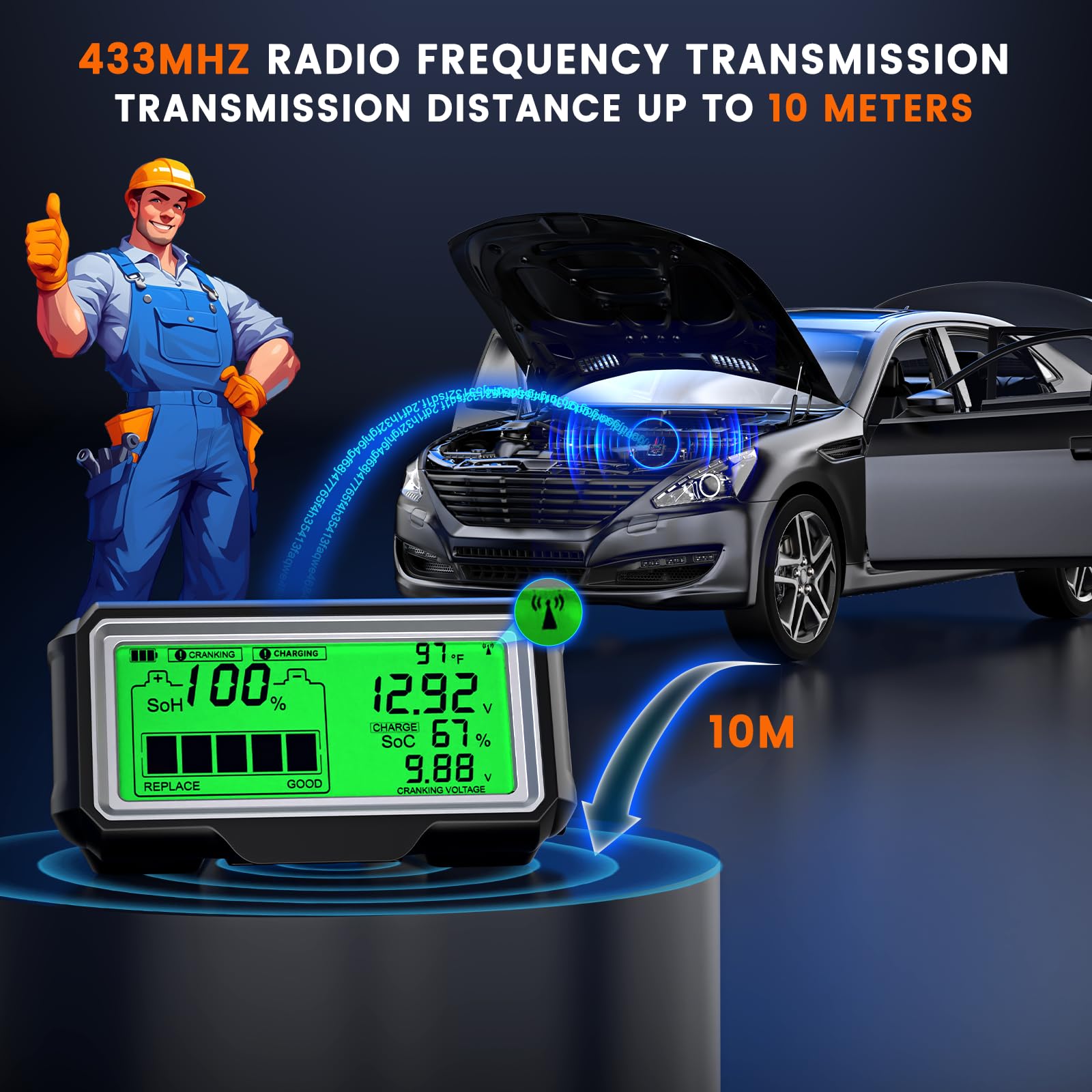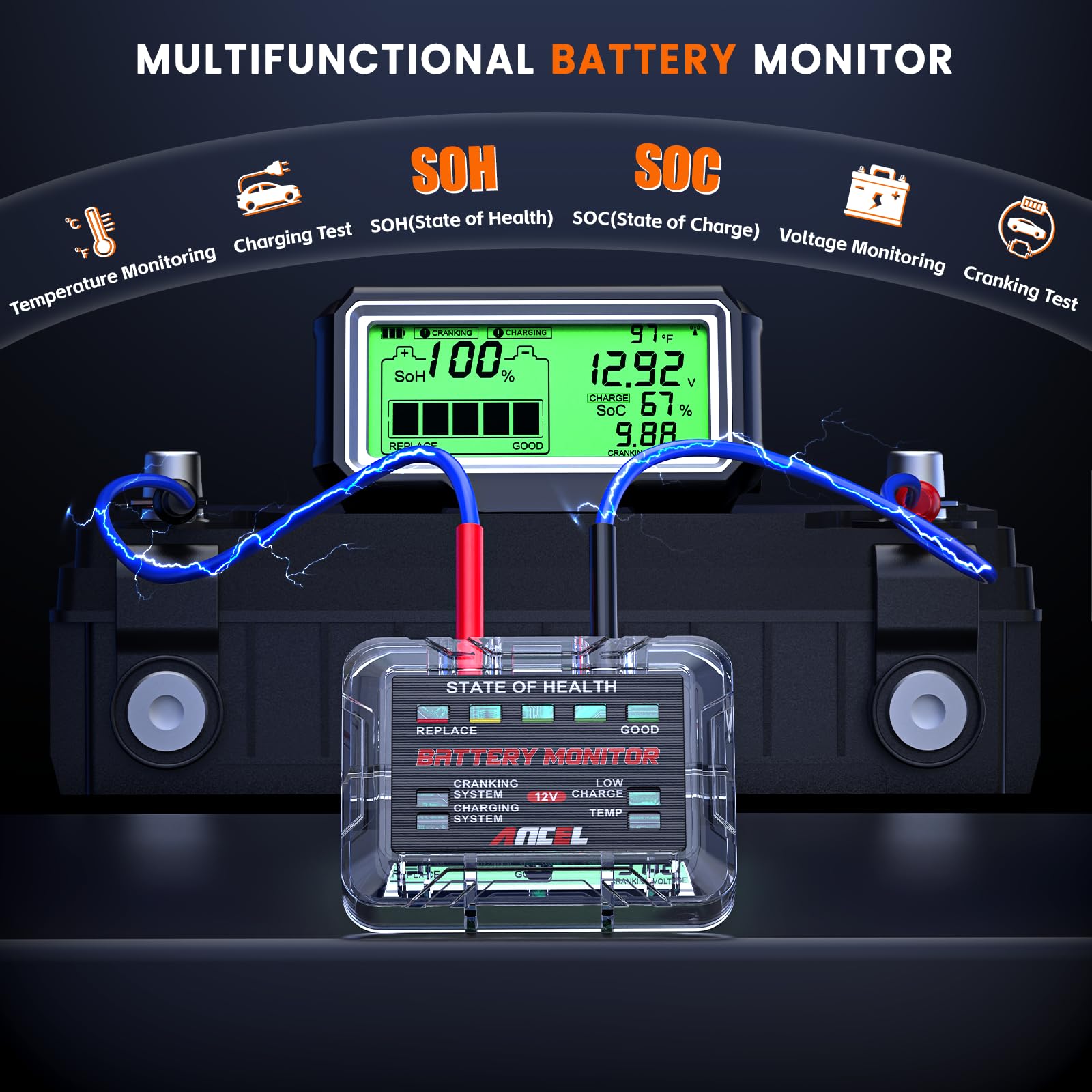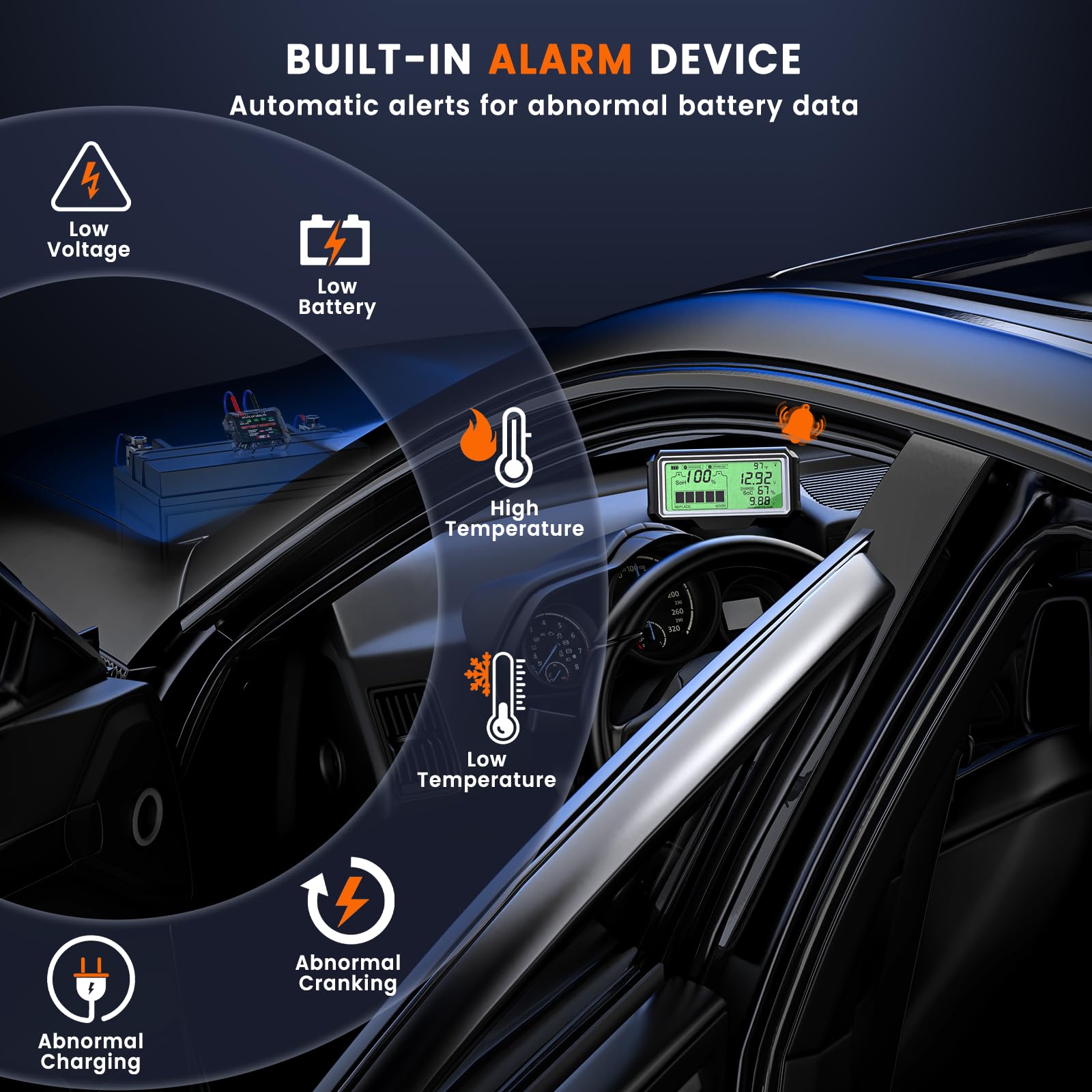 【Real-time Monitoring, Worry-free Safety】ANCEL BM200 PRO consists of a wireless host and a wireless display screen, which refreshes 12v battery monitor of voltage, power, and temperature in real time every second to accurately capture every second of power changes. Once the battery tester experiences sudden temperature changes, abnormal voltage, or system failures, it immediately sounds an audible and visual alarm to help you respond in a timely manner and prevent potential problems.